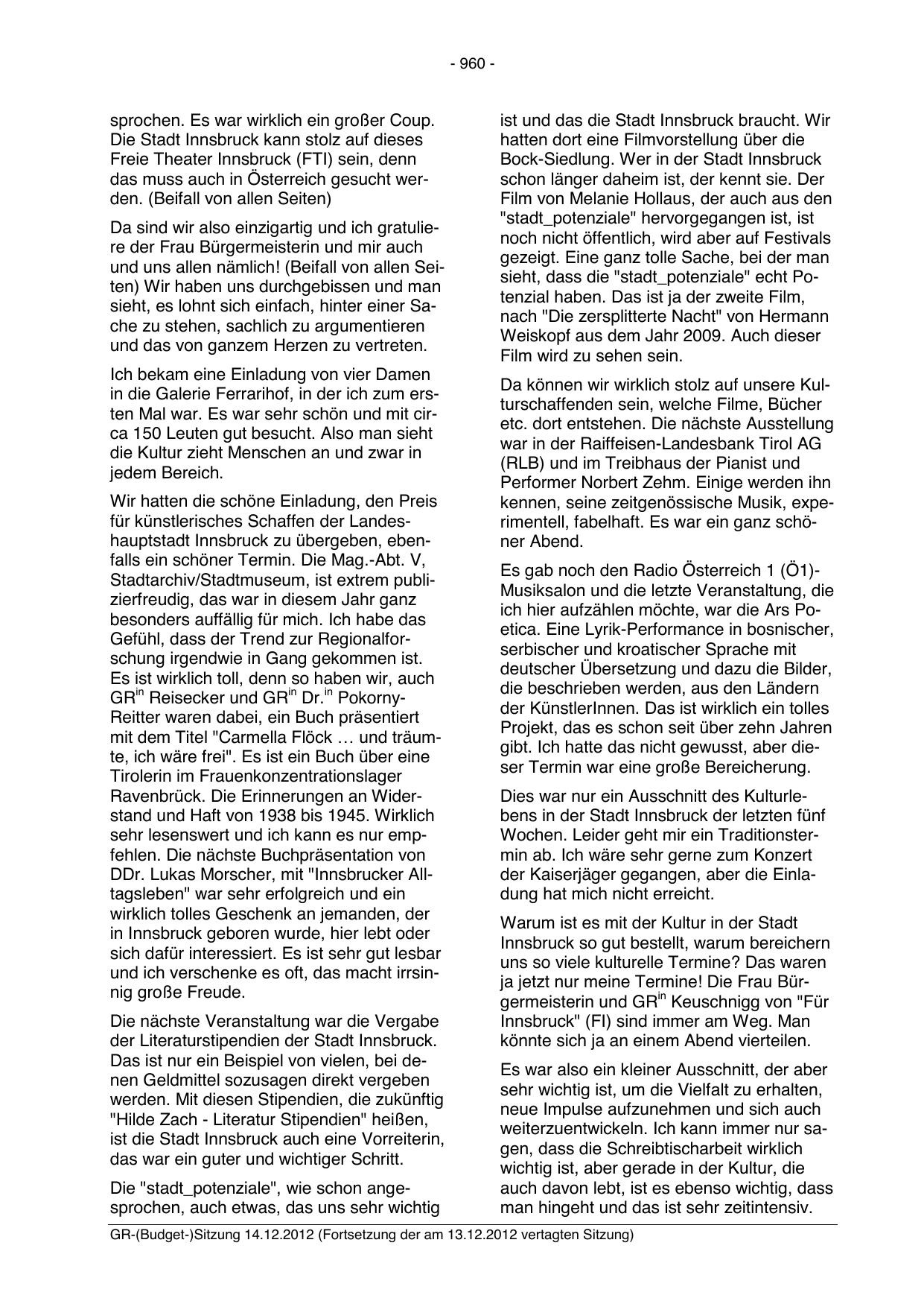 für künstlerisches Schaffen der Landeshauptstadt Innsbruck zu übergeben, ebenfalls ein schöner Termin. Die Mag.-Abt. V,