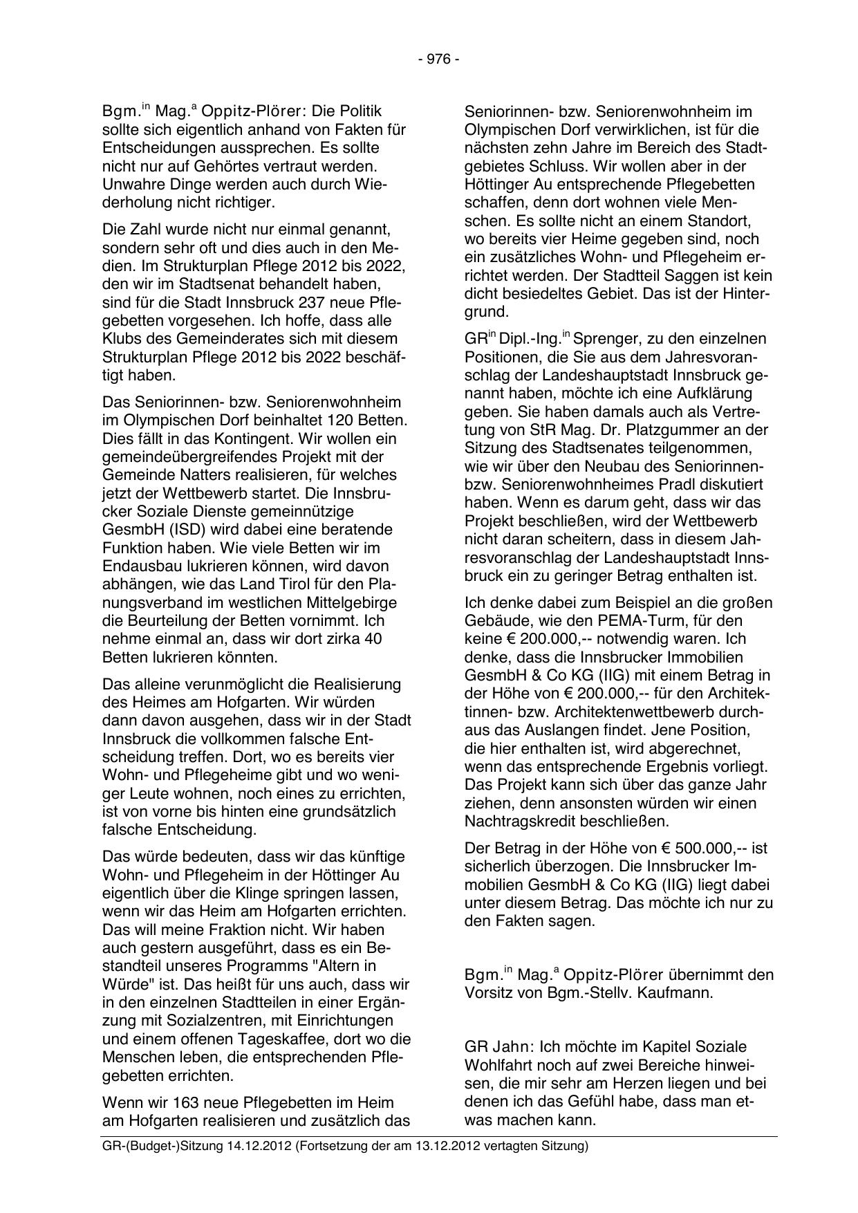 sind für die Stadt Innsbruck 237 neue Pflegebetten vorgesehen. Ich hoffe, dass alle