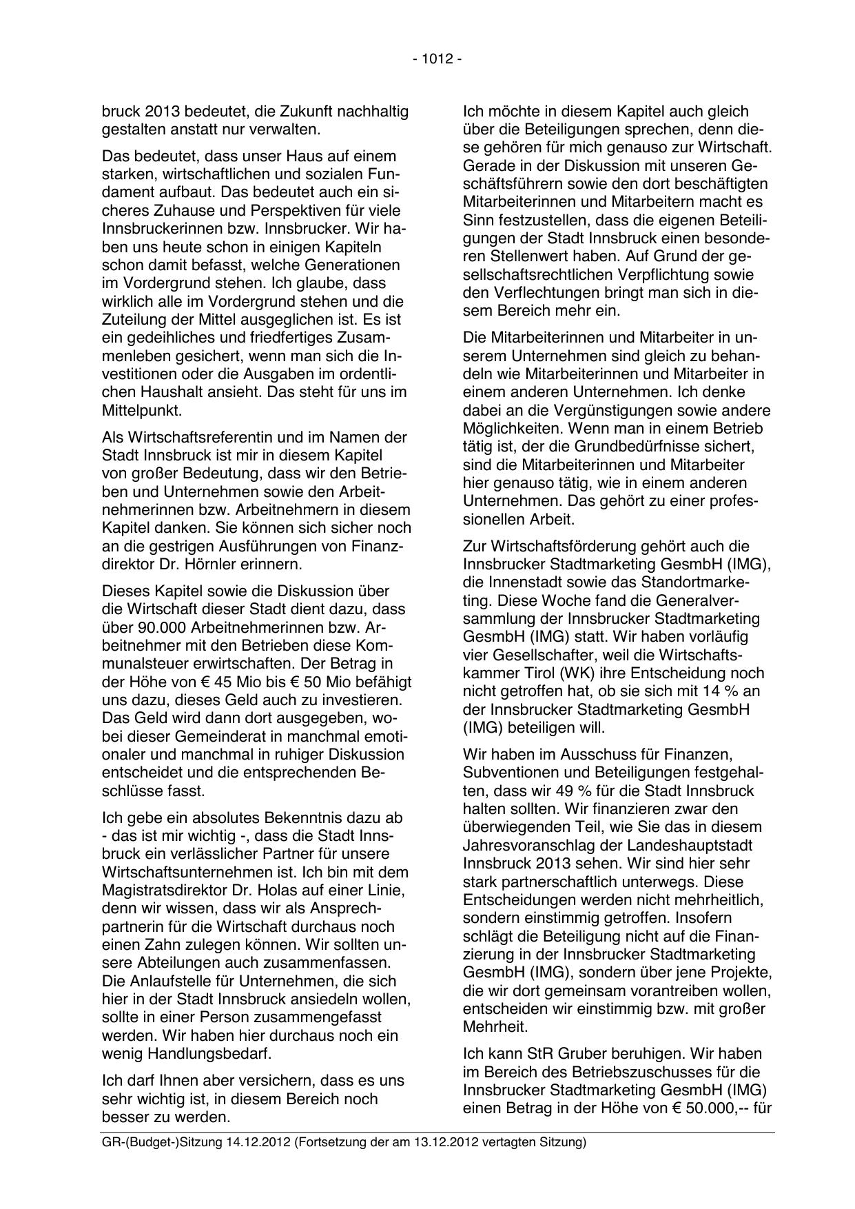 GR-(Budget-)Sitzung 14.12.2012 (Fortsetzung der am 13.12.2012 vertagten Sitzung)