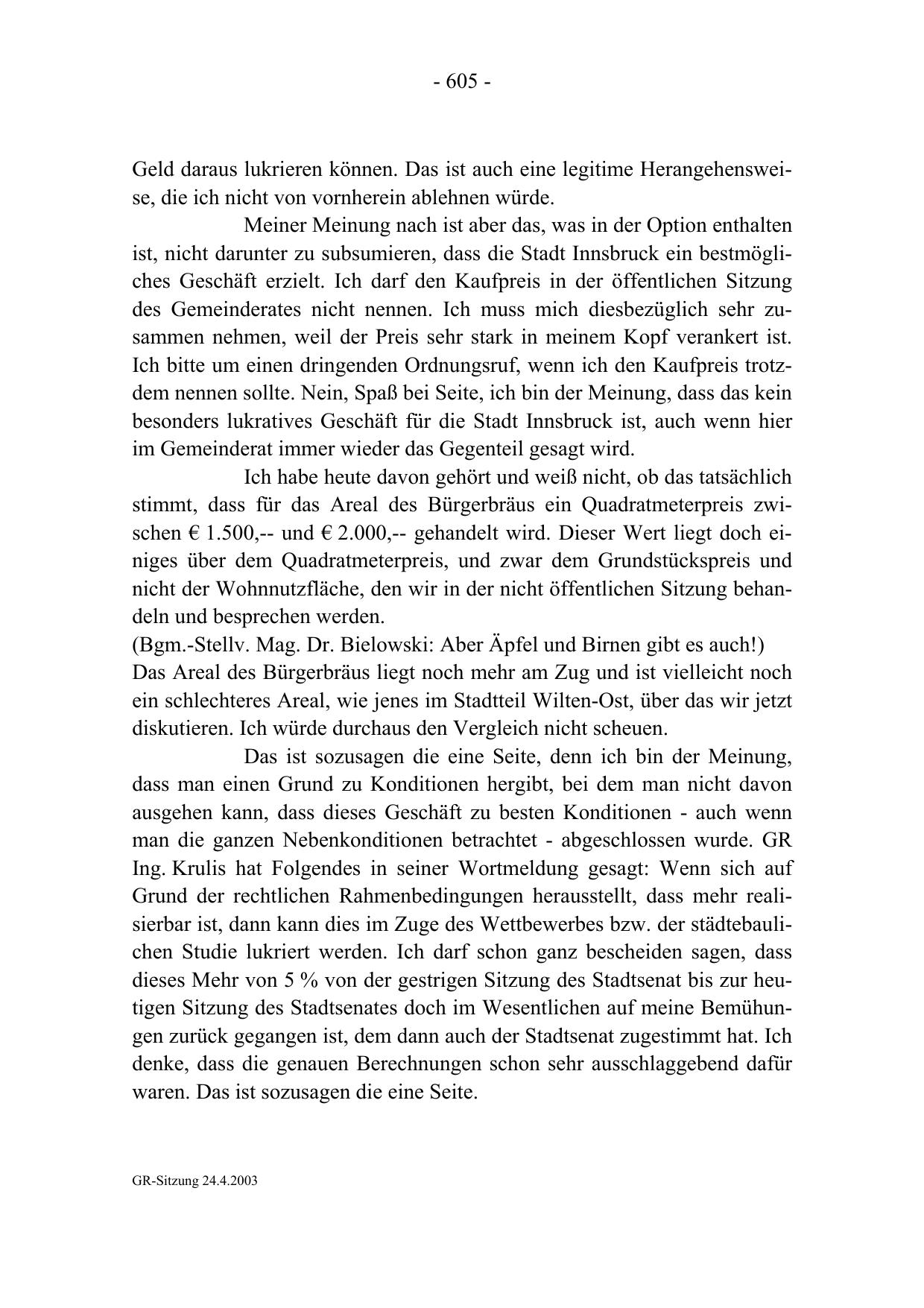 stimmt, dass für das Areal des Bürgerbräus ein Quadratmeterpreis zwischen € 1.500,-- und € 2.000,-- gehandelt wird. Dieser Wert liegt doch einiges über dem Quadratmeterpreis, und zwar dem Grundstückspreis und