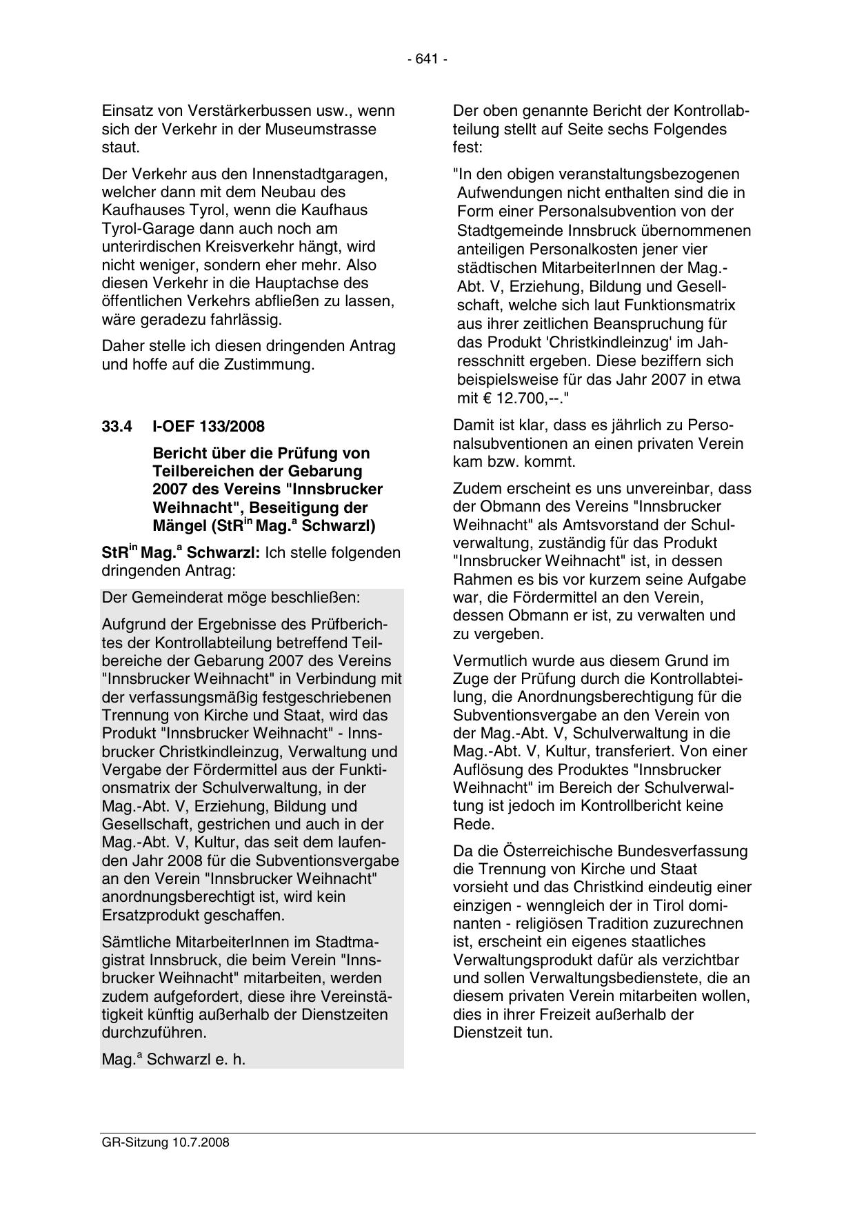 Aufgrund der Ergebnisse des Prüfberichtes der Kontrollabteilung betreffend Teilbereiche der Gebarung 2007 des Vereins