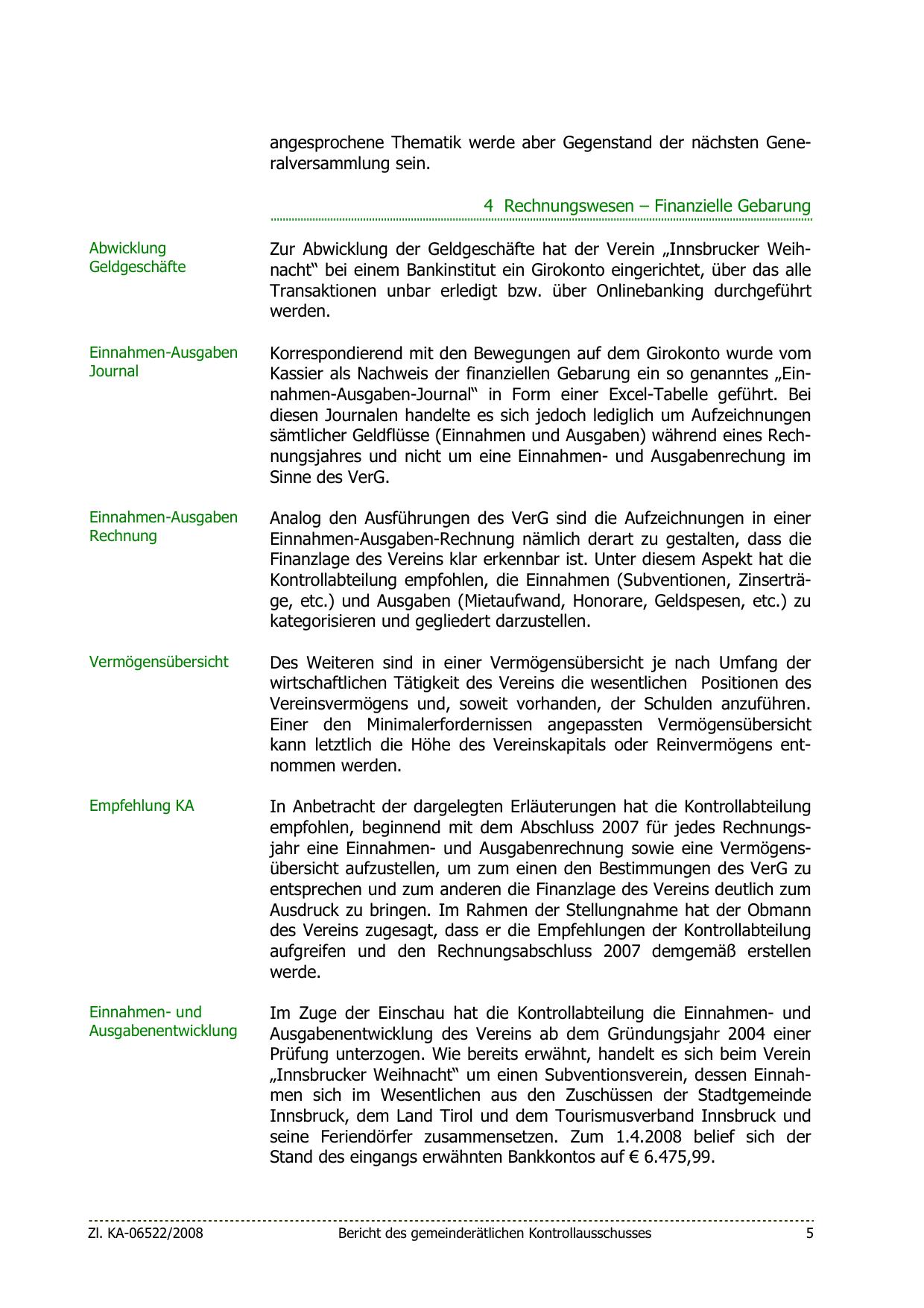 empfohlen, beginnend mit dem Abschluss 2007 für jedes Rechnungsjahr eine Einnahmen- und Ausgabenrechnung sowie eine Vermögensübersicht aufzustellen, um zum einen den Bestimmungen des VerG zu