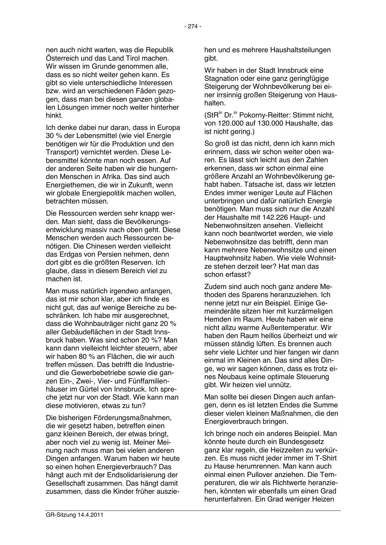 treffen müssen. Das betrifft die Industrieund die Gewerbebetriebe sowie die ganzen Ein-, Zwei-, Vier- und Fünffamilienhäuser im Gürtel von Innsbruck. Ich spreche jetzt nur von der Stadt. Wie kann man