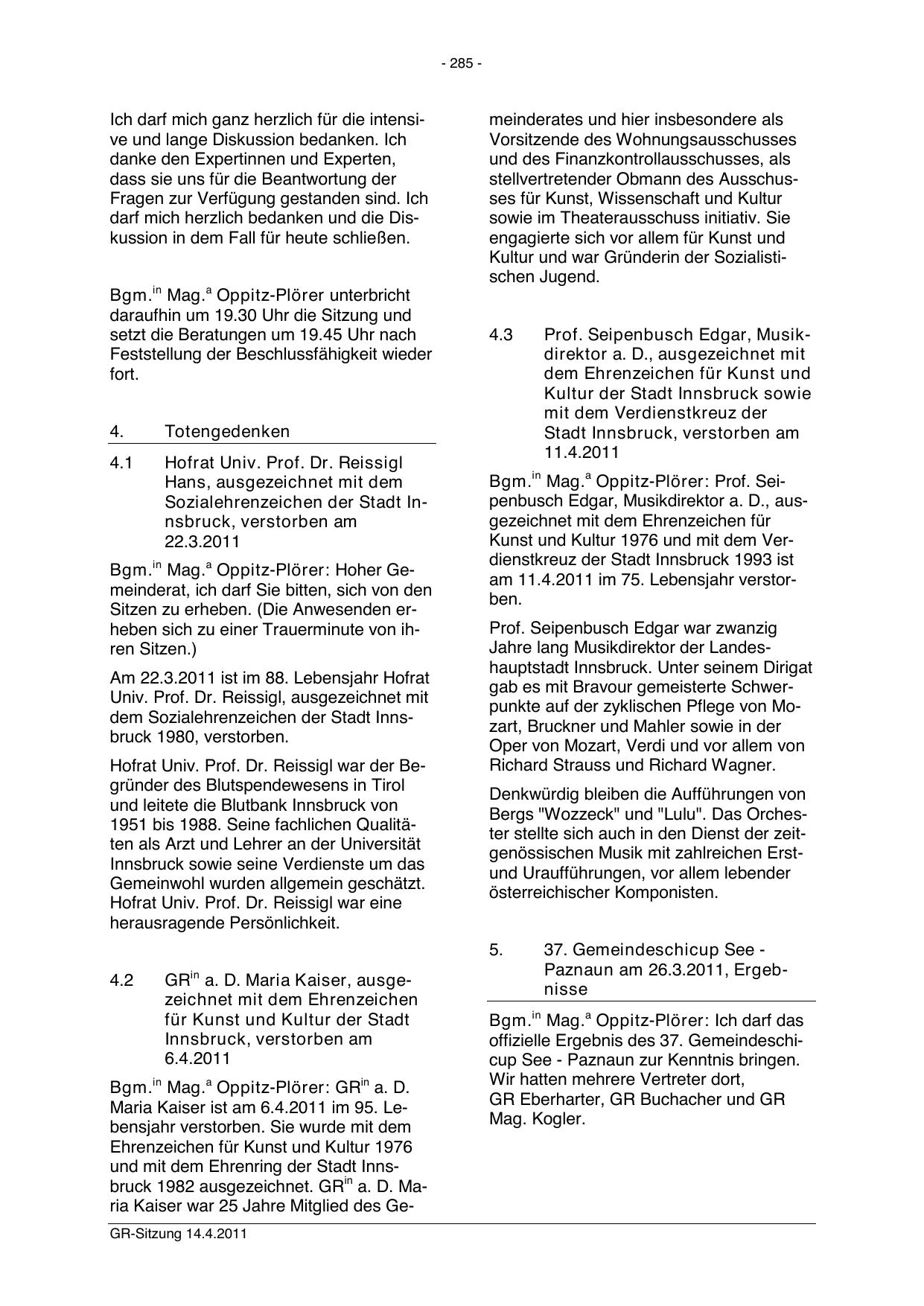 und mit dem Ehrenring der Stadt Innsbruck 1982 ausgezeichnet. GRin a. D. Maria Kaiser war 25 Jahre Mitglied des GeGR-Sitzung 14.4.2011