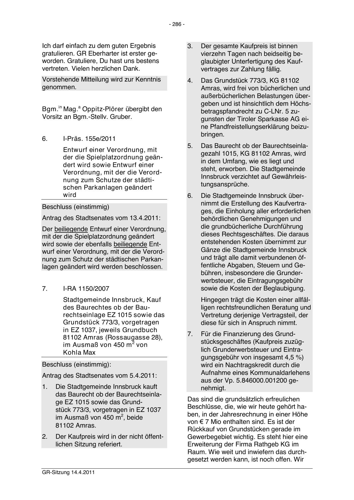 Die Stadtgemeinde Innsbruck übernimmt die Erstellung des Kaufvertrages, die Einholung aller erforderlichen