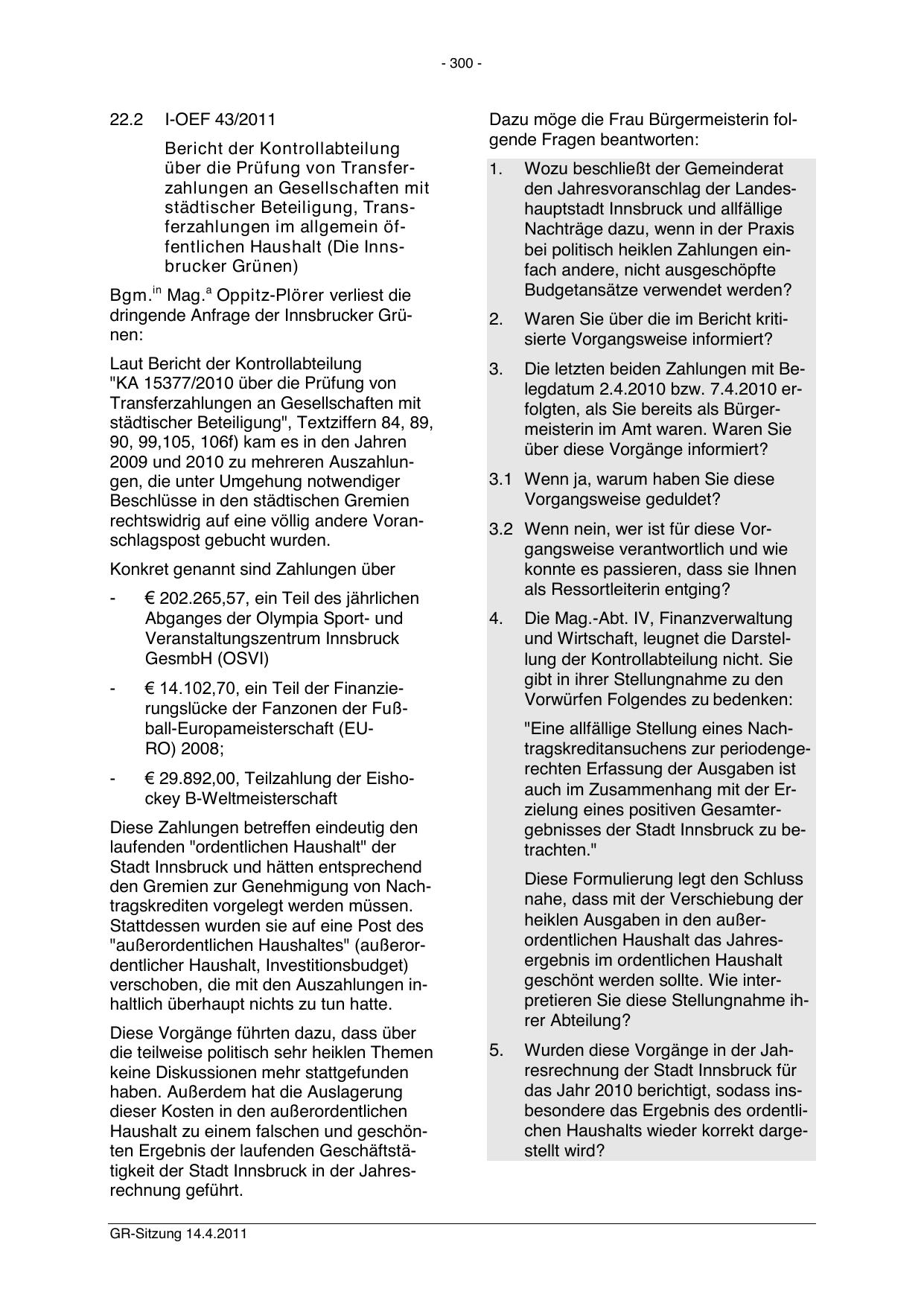 Wurden diese Vorgänge in der Jahresrechnung der Stadt Innsbruck für