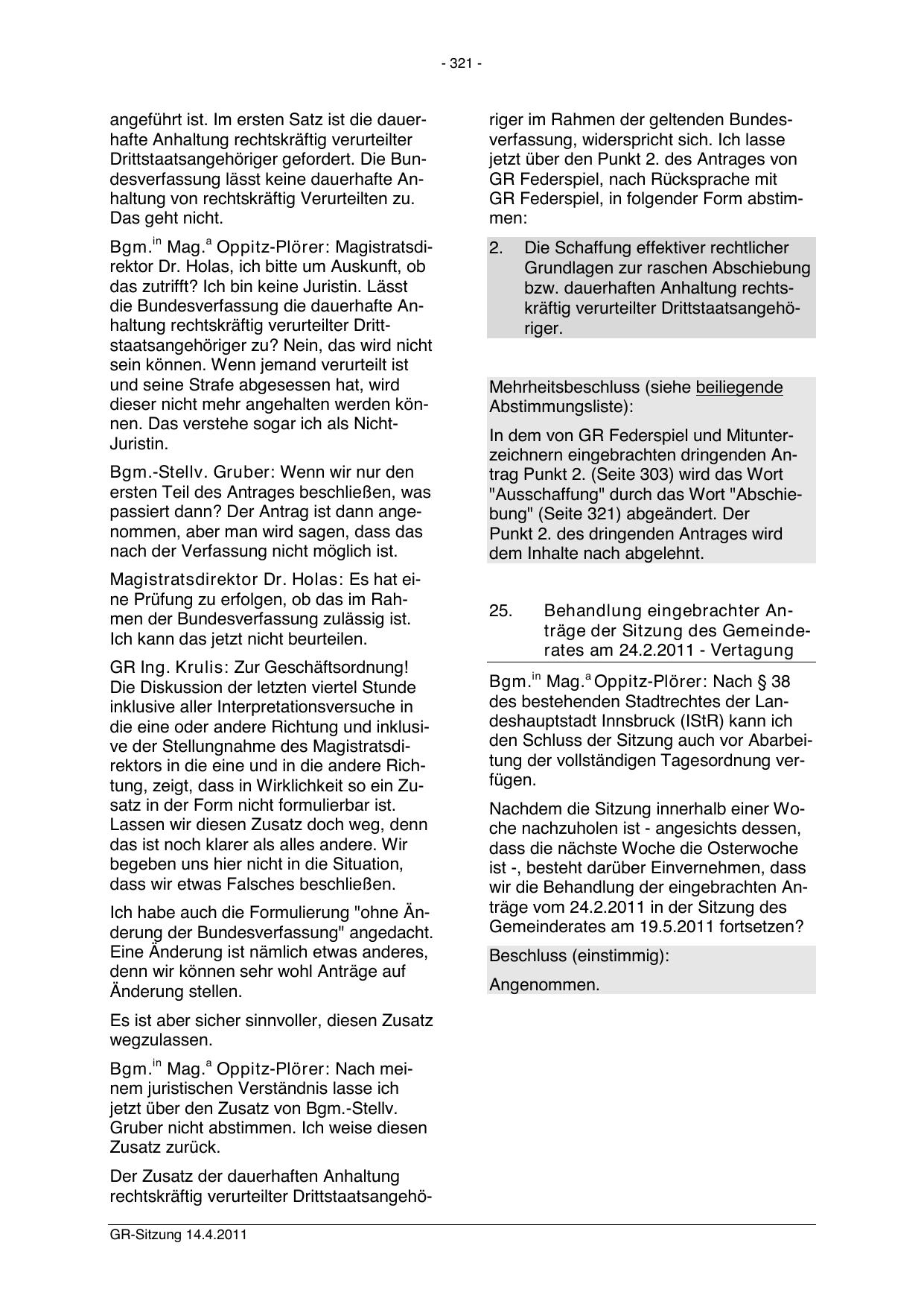In dem von GR Federspiel und Mitunterzeichnern eingebrachten dringenden Antrag Punkt 2. (Seite 303) wird das Wort