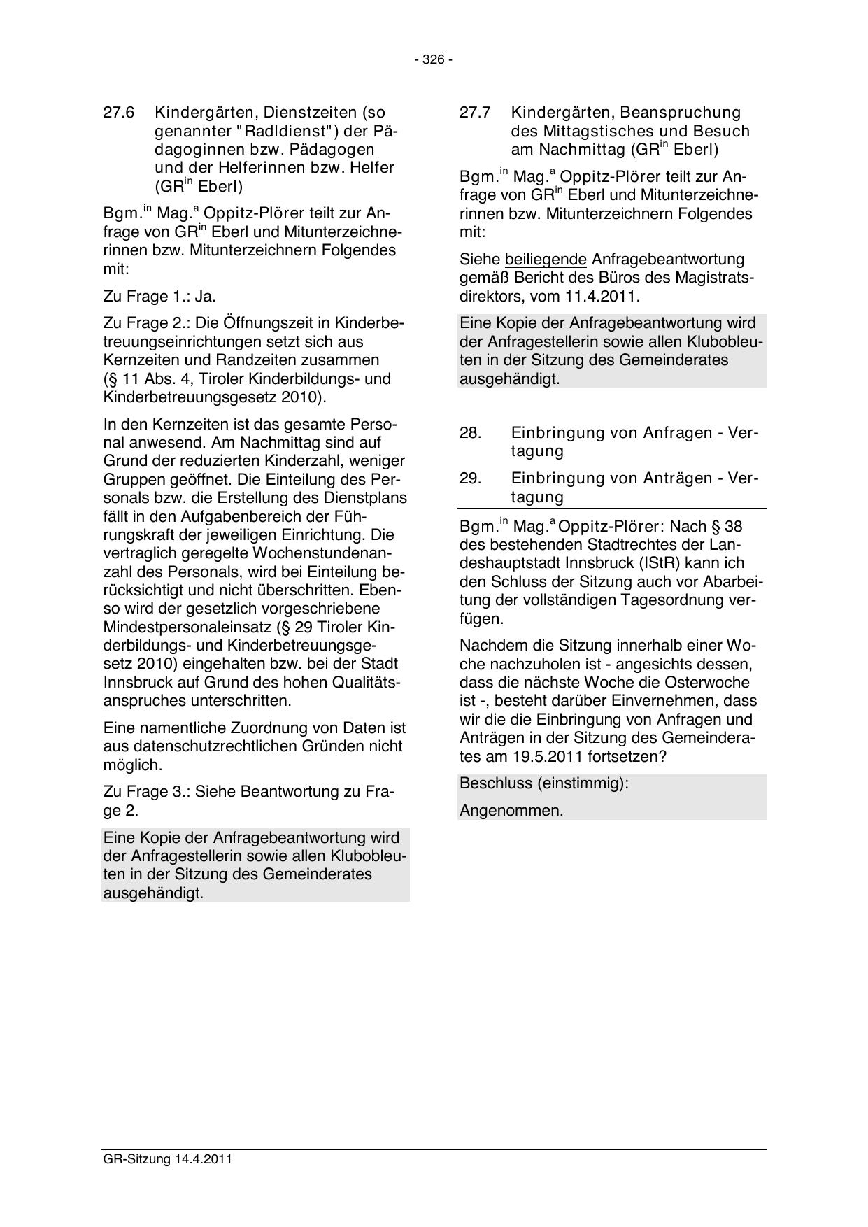 Anträgen in der Sitzung des Gemeinderates am 19.5.2011 fortsetzen?