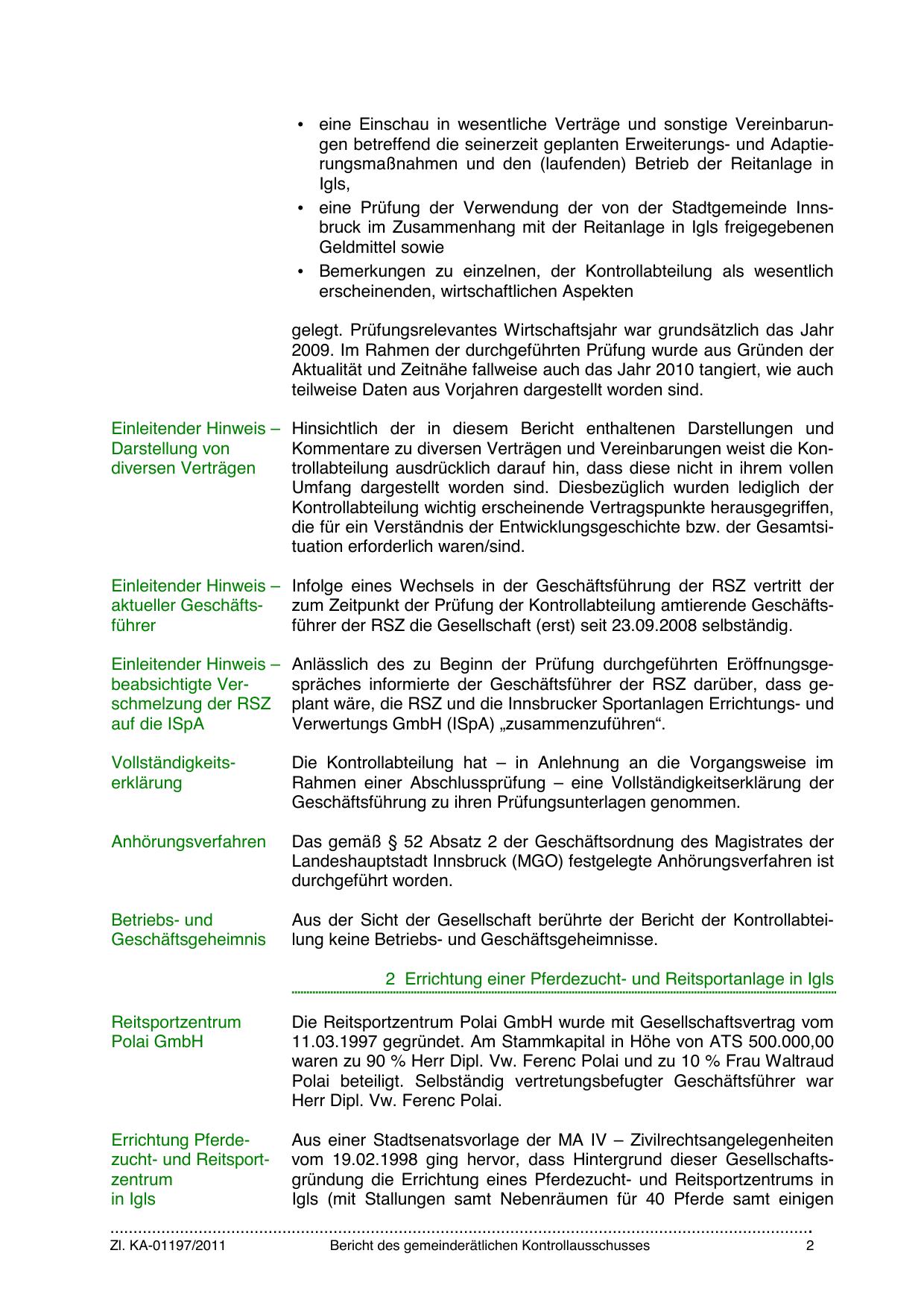 Einleitender Hinweis – Anlässlich des zu Beginn der Prüfung durchgeführten Eröffnungsgespräches informierte der Geschäftsführer der RSZ darüber, dass gebeabsichtigte Verschmelzung der RSZ plant wäre, die RSZ und die Innsbrucker Sportanlagen Errichtungs- und