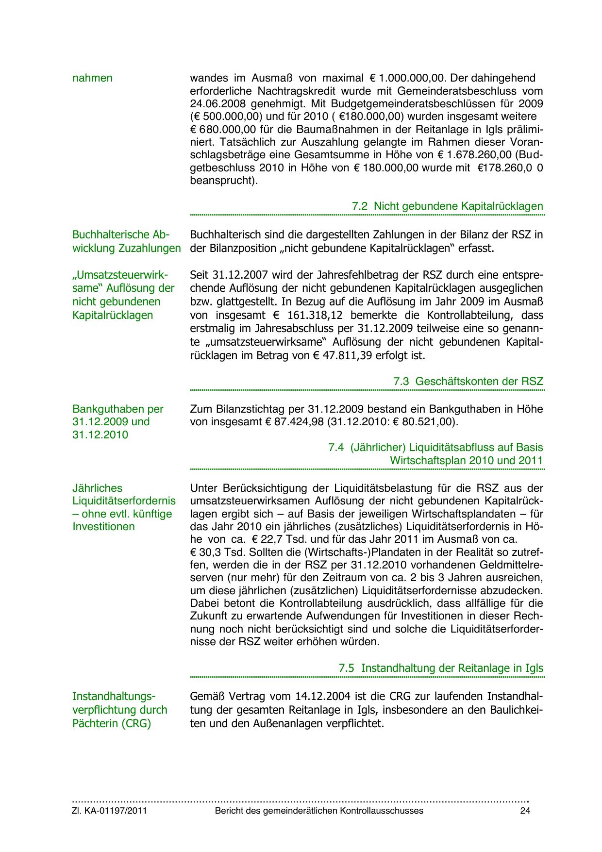 € 30,3 Tsd. Sollten die (Wirtschafts-)Plandaten in der Realität so zutreffen, werden die in der RSZ per 31.12.2010 vorhandenen Geldmittelreserven (nur mehr) für den Zeitraum von ca. 2 bis 3 Jahren ausreichen,