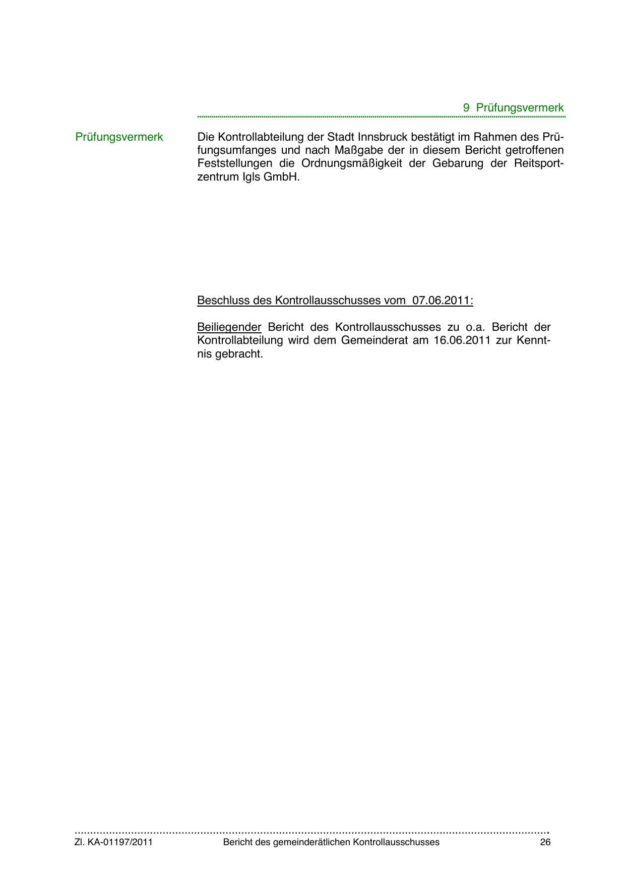 Feststellungen die Ordnungsmäßigkeit der Gebarung der Reitsportzentrum Igls GmbH.