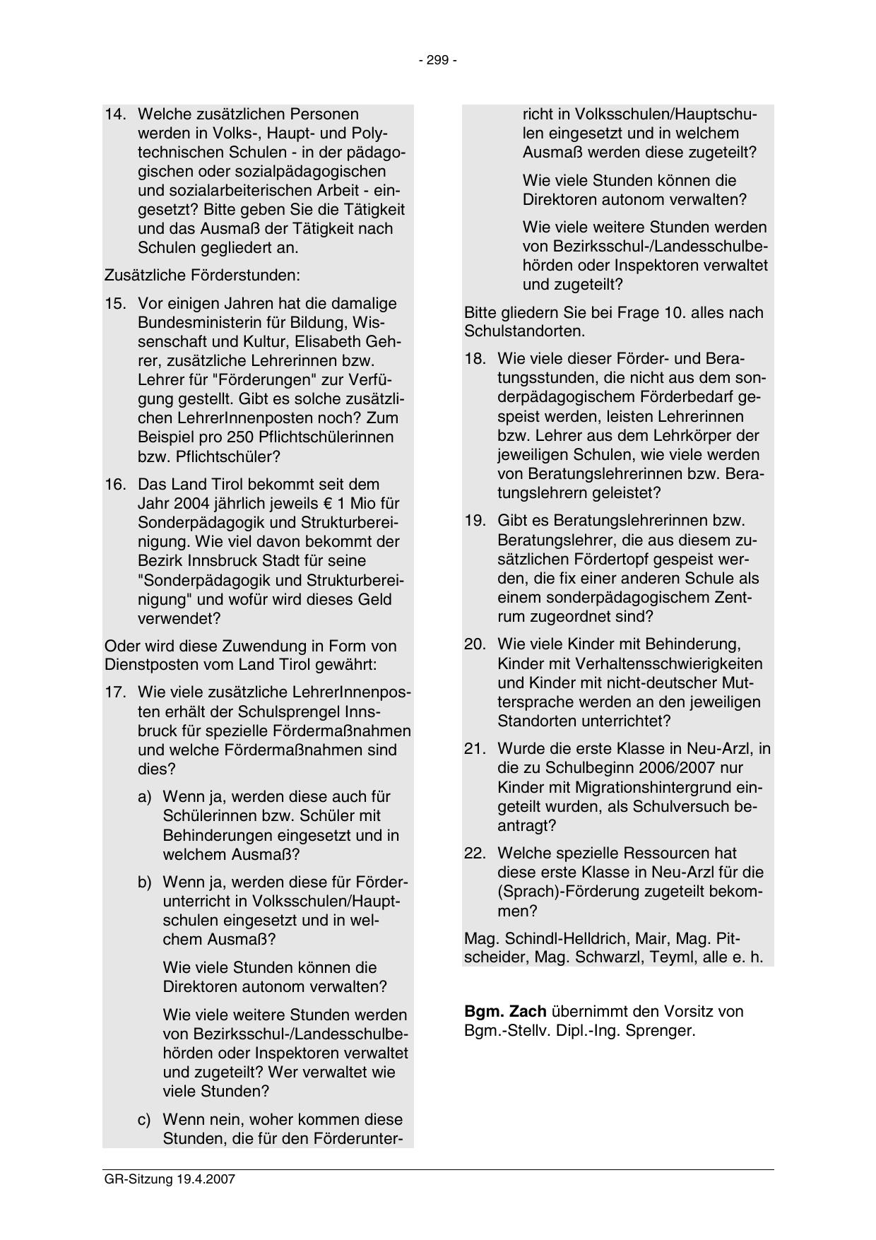 Stunden, die für den FörderunterGR-Sitzung 19.4.2007