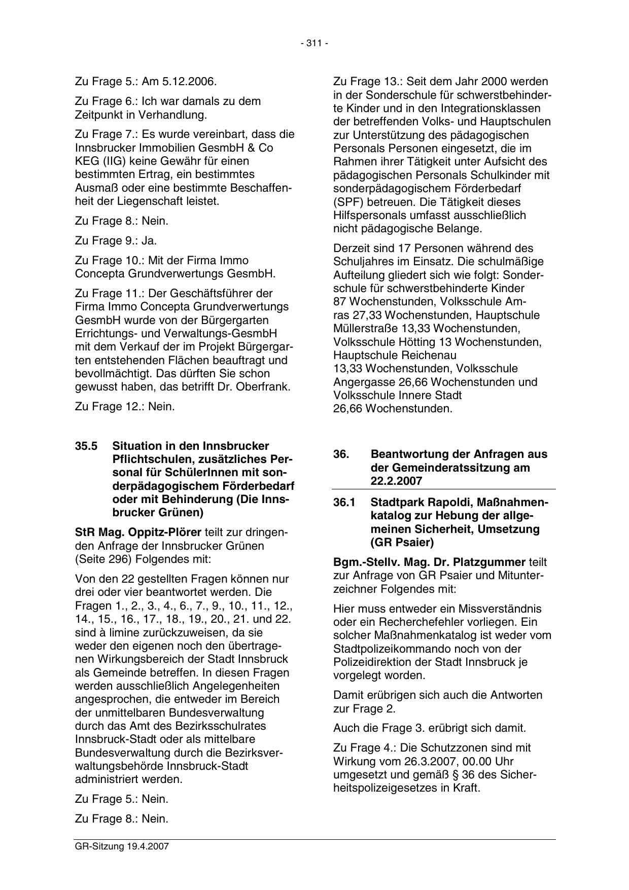 StR Mag. Oppitz-Plörer teilt zur dringenden Anfrage der Innsbrucker Grünen