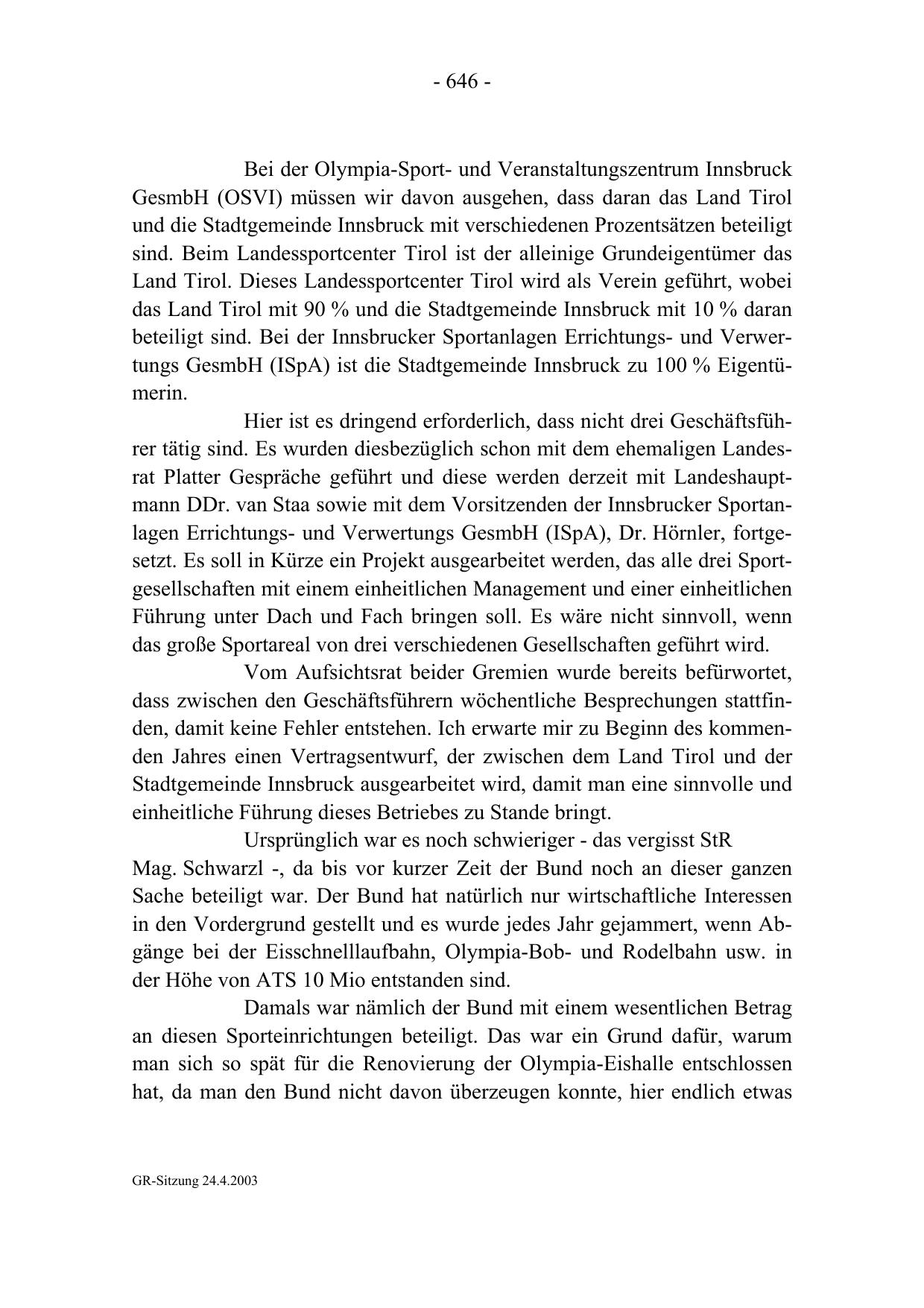 Hier ist es dringend erforderlich, dass nicht drei Geschäftsführer tätig sind. Es wurden diesbezüglich schon mit dem ehemaligen Landesrat Platter Gespräche geführt und diese werden derzeit mit Landeshauptmann DDr. van Staa sowie mit dem Vorsitzenden der Innsbrucker Sportanlagen Errichtungs- und Verwertungs GesmbH (ISpA), Dr. Hörnler, fortgesetzt. Es soll in Kürze ein Projekt ausgearbeitet werden, das alle drei Sportgesellschaften mit einem einheitlichen Management und einer einheitlichen