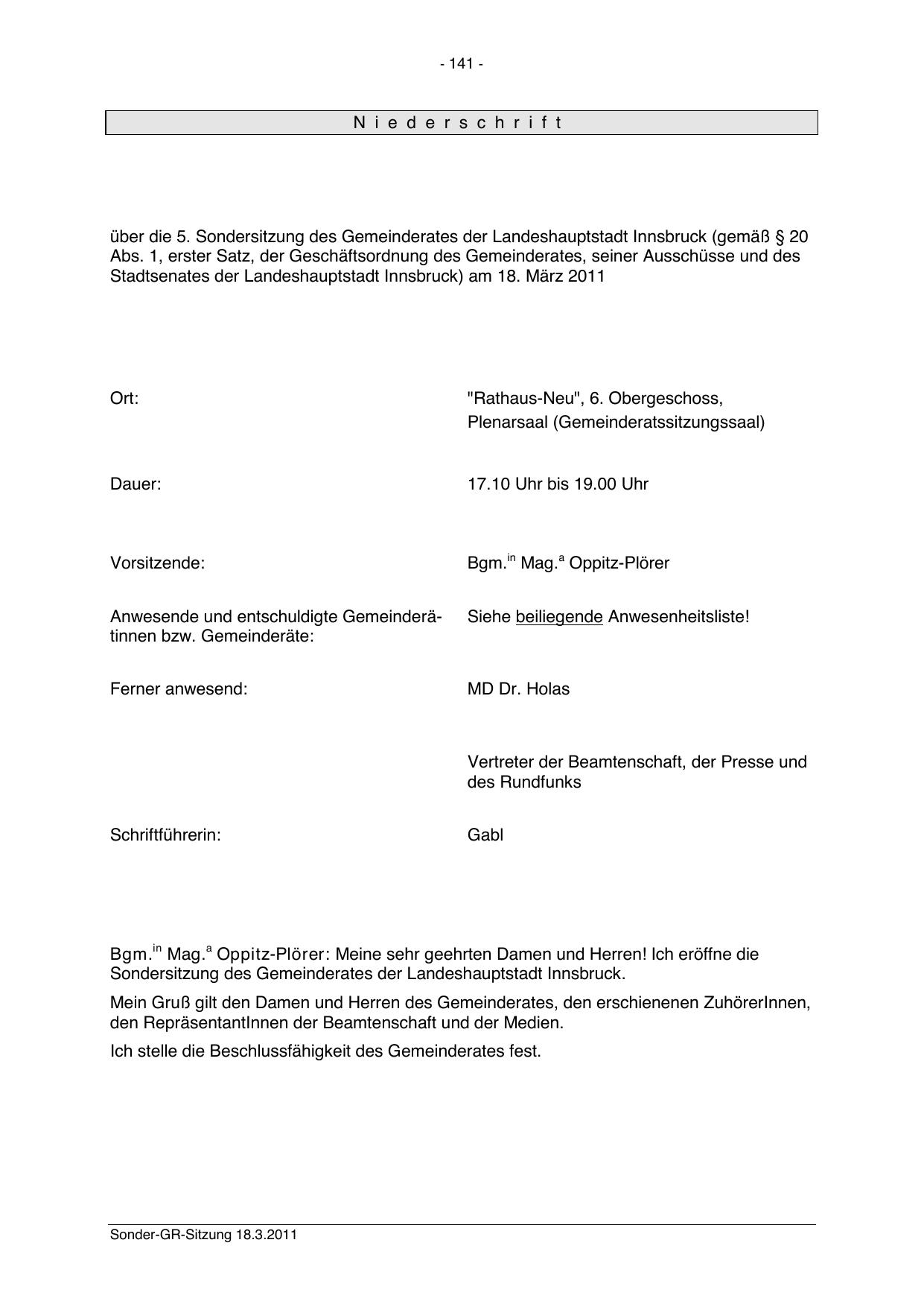 über die 5. Sondersitzung des Gemeinderates der Landeshauptstadt Innsbruck (gemäß § 20