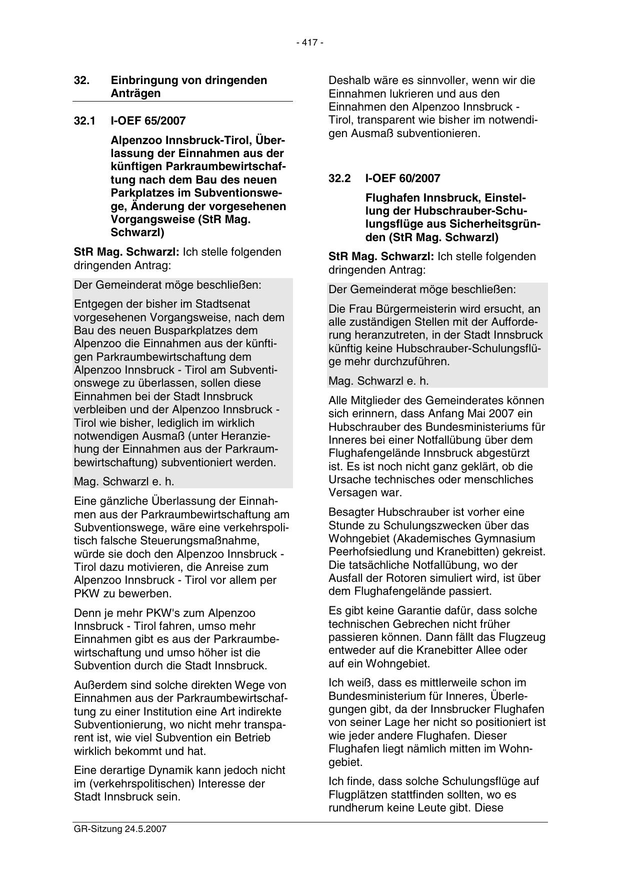 Flughafen Innsbruck, Einstellung der Hubschrauber-Schulungsflüge aus Sicherheitsgründen (StR Mag. Schwarzl)