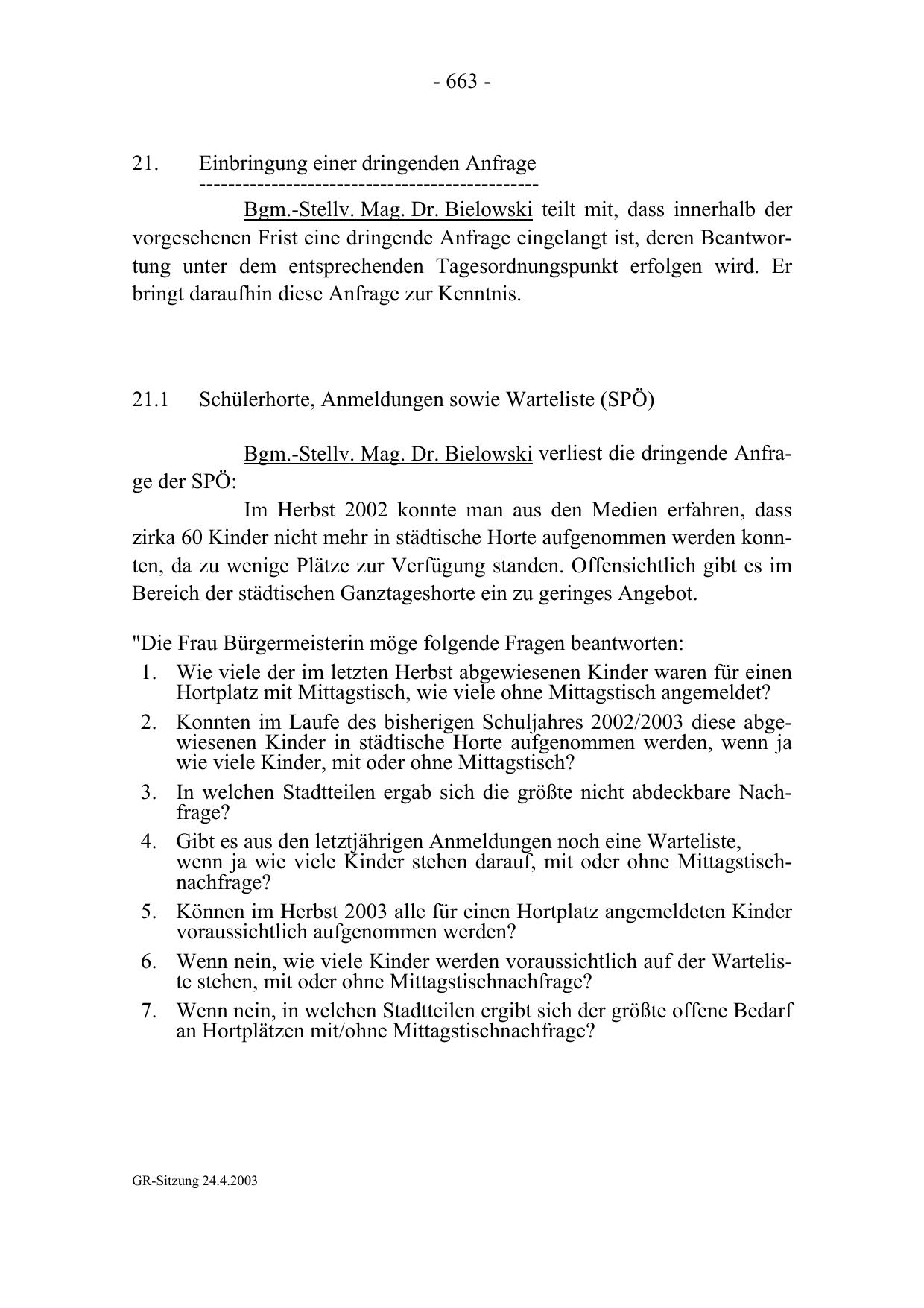 Bgm.-Stellv. Mag. Dr. Bielowski verliest die dringende Anfra-