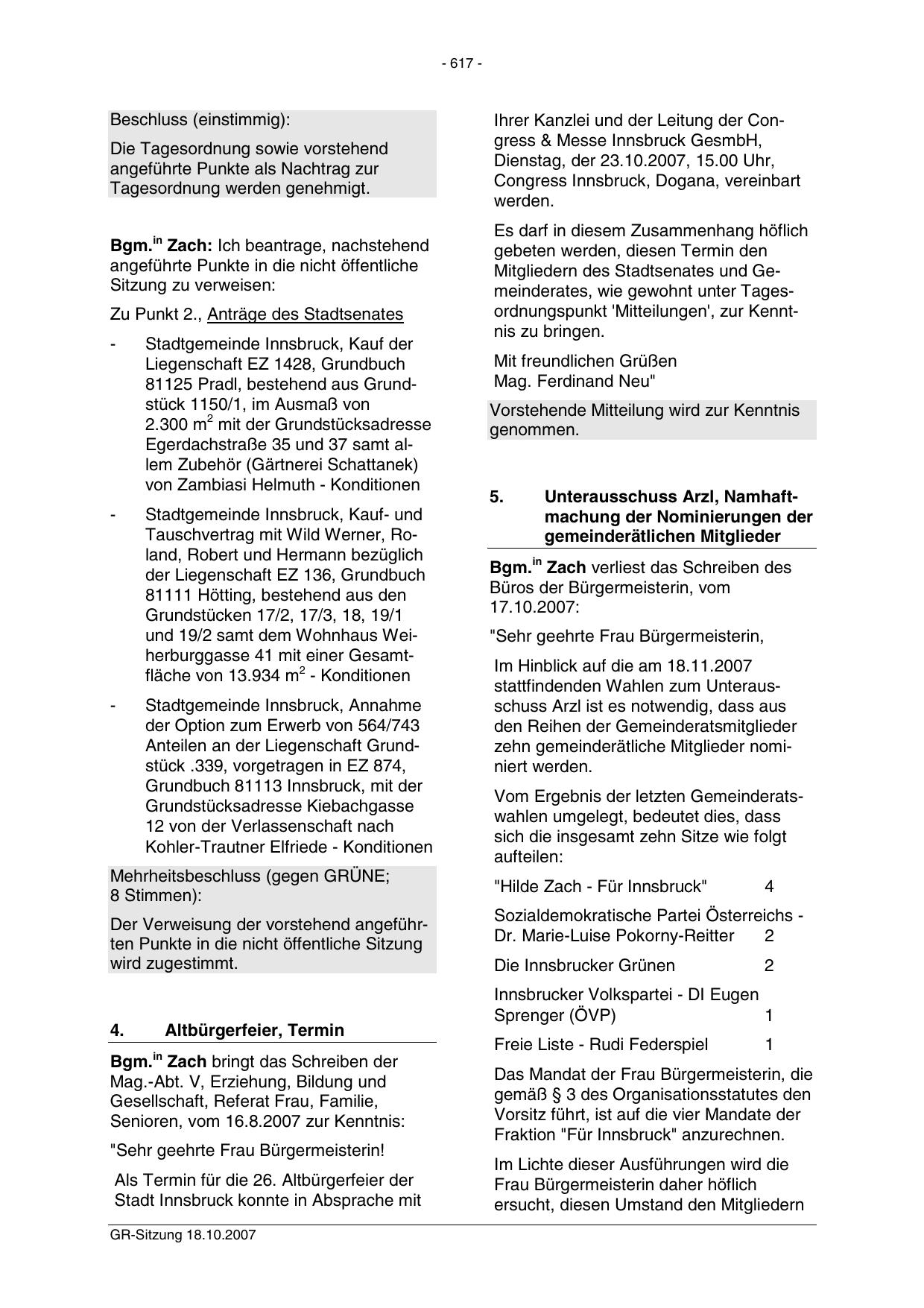 Mitgliedern des Stadtsenates und Gemeinderates, wie gewohnt unter Tagesordnungspunkt "Mitteilungen", zur Kenntnis zu bringen.