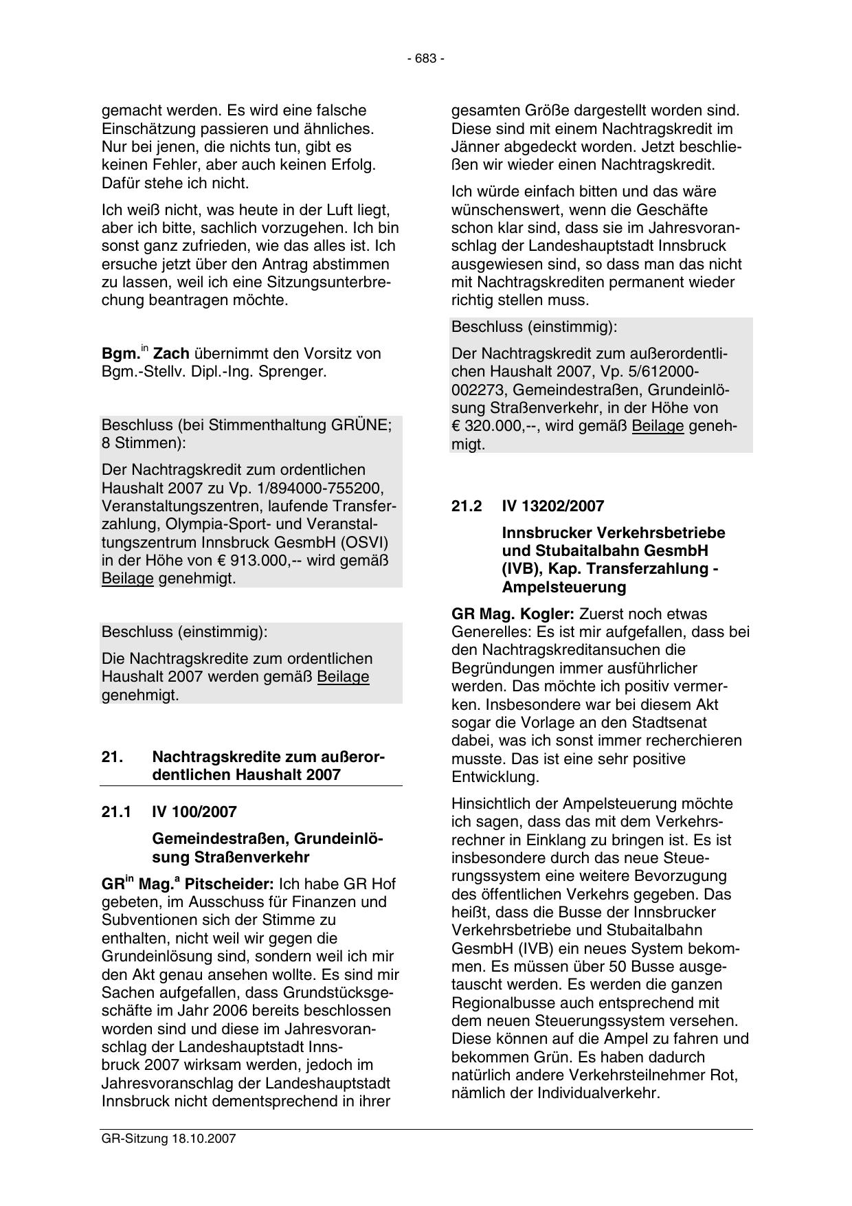 worden sind und diese im Jahresvoranschlag der Landeshauptstadt Innsbruck 2007 wirksam werden, jedoch im