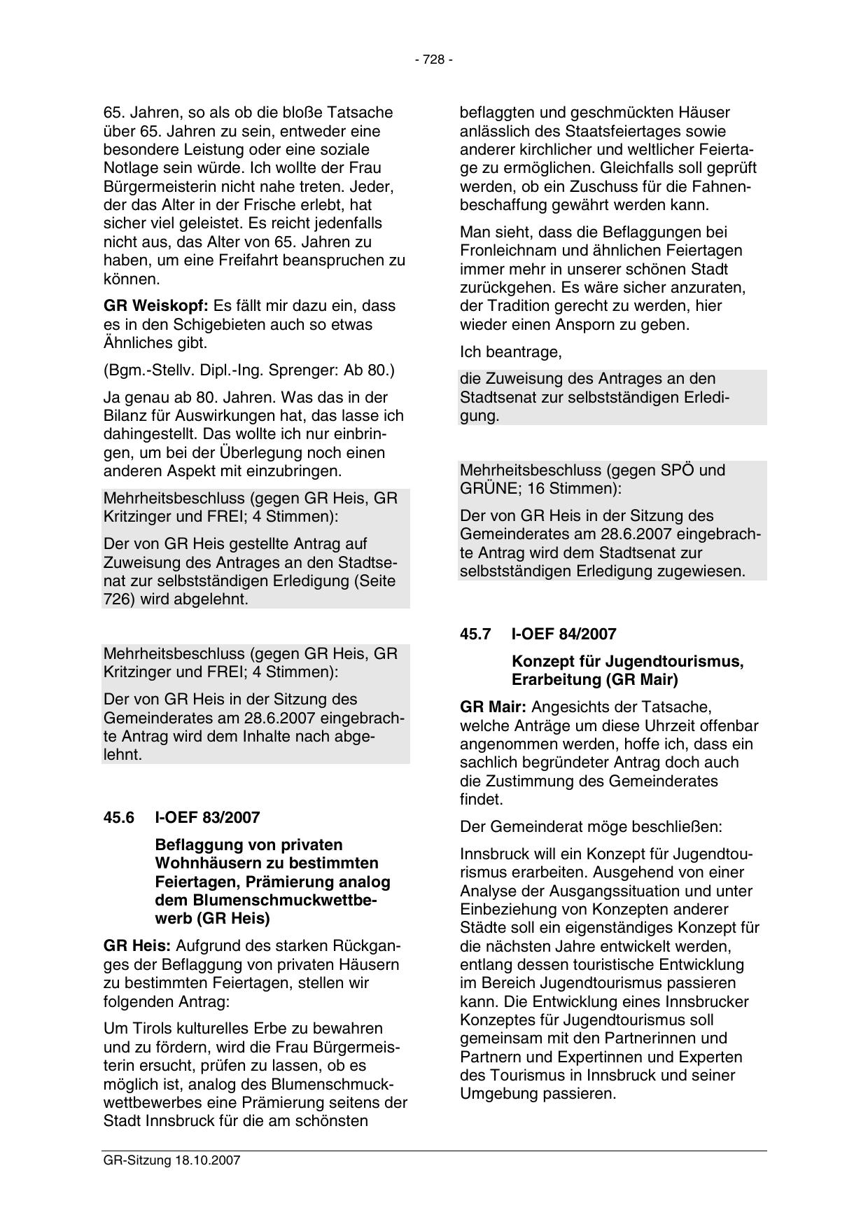 Gemeinderates am 28.6.2007 eingebrachte Antrag wird dem Inhalte nach abgelehnt.