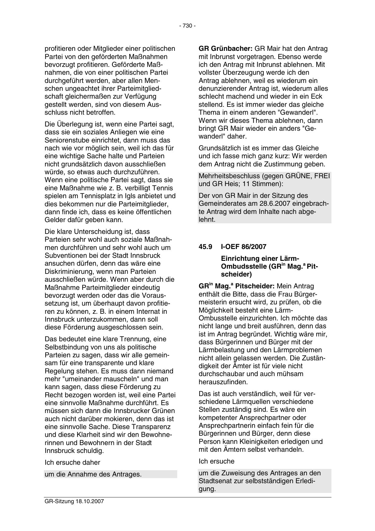 Gemeinderates am 28.6.2007 eingebrachte Antrag wird dem Inhalte nach abgelehnt.