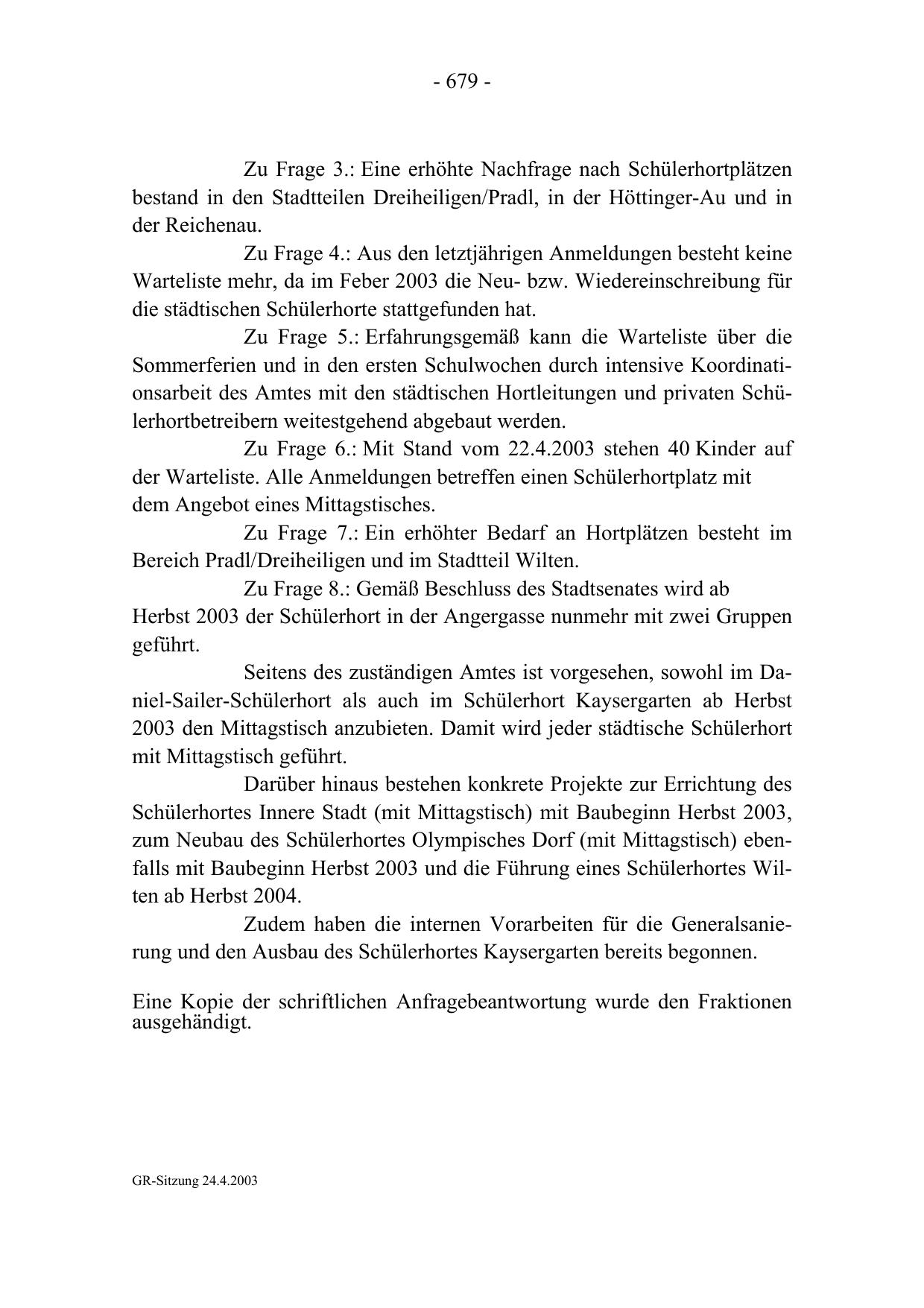 zum Neubau des Schülerhortes Olympisches Dorf (mit Mittagstisch) ebenfalls mit Baubeginn Herbst 2003 und die Führung eines Schülerhortes Wilten ab Herbst 2004.