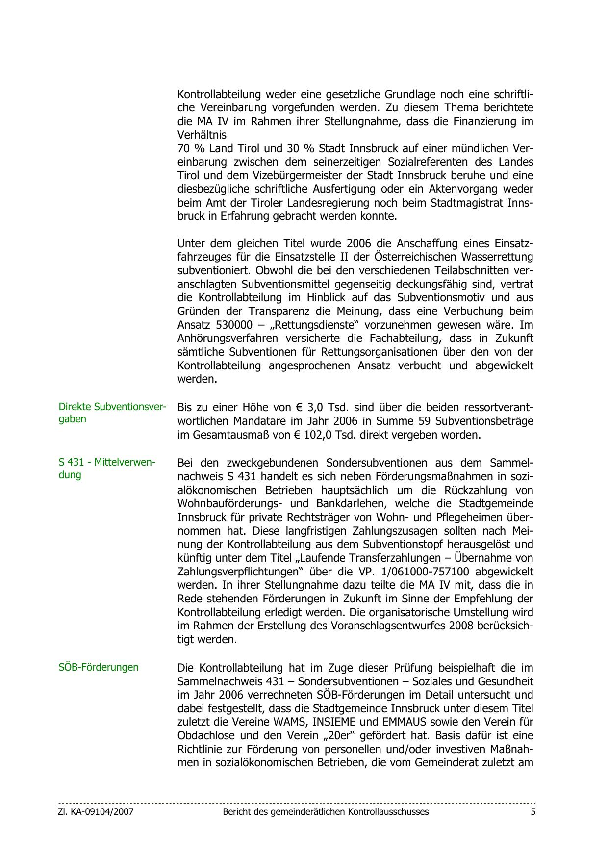 Innsbruck für private Rechtsträger von Wohn- und Pflegeheimen übernommen hat. Diese langfristigen Zahlungszusagen sollten nach Meinung der Kontrollabteilung aus dem Subventionstopf herausgelöst und