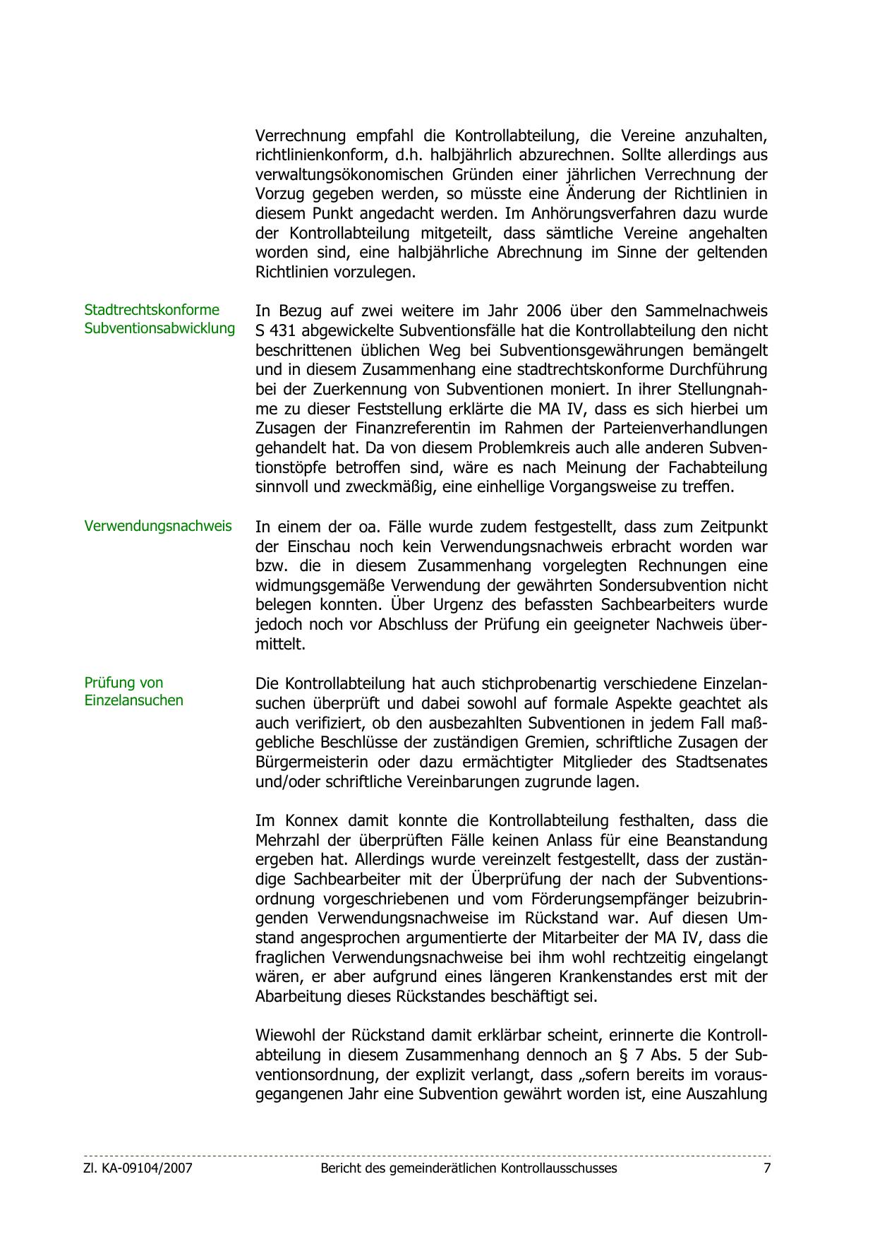 ergeben hat. Allerdings wurde vereinzelt festgestellt, dass der zuständige Sachbearbeiter mit der Überprüfung der nach der Subventionsordnung vorgeschriebenen und vom Förderungsempfänger beizubringenden Verwendungsnachweise im Rückstand war. Auf diesen Umstand angesprochen argumentierte der Mitarbeiter der MA IV, dass die