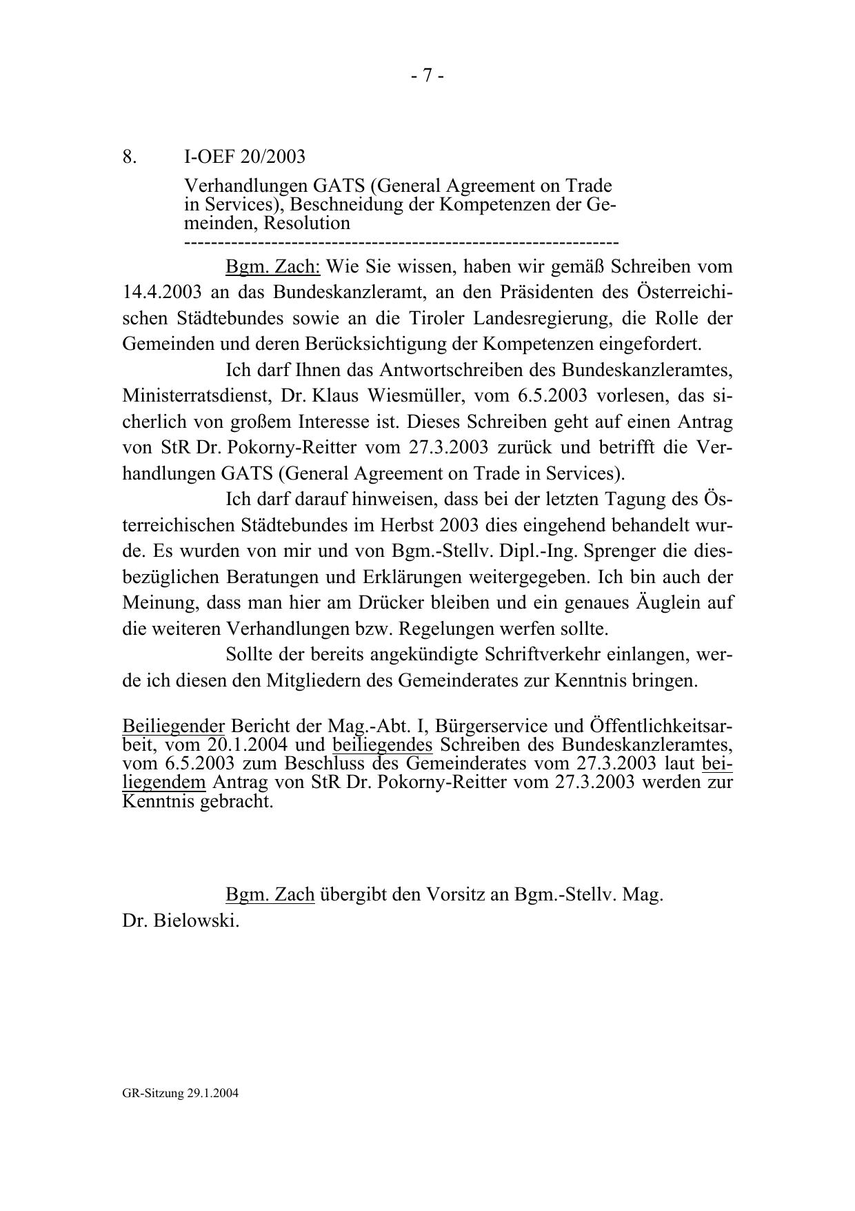 von StR Dr. Pokorny-Reitter vom 27.3.2003 zurück und betrifft die Verhandlungen GATS (General Agreement on Trade in Services).