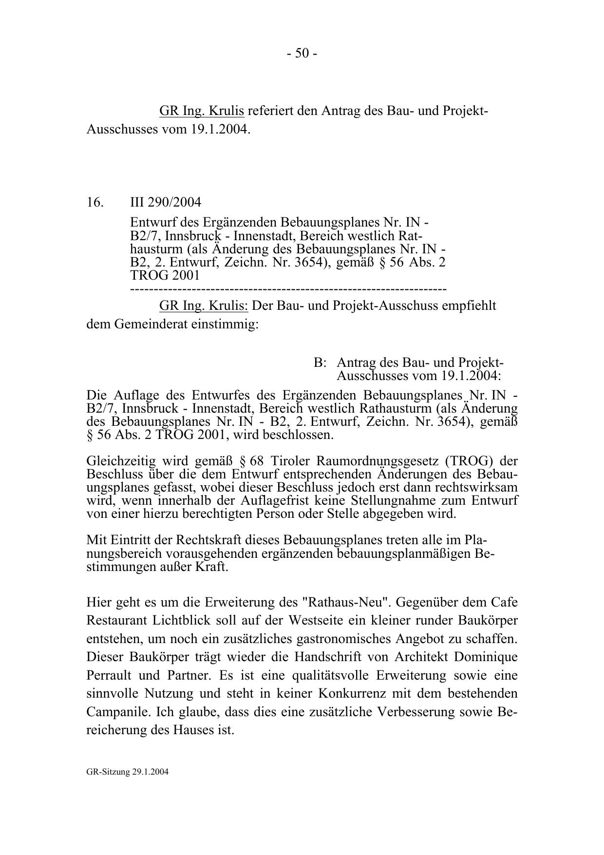 GR Ing. Krulis referiert den Antrag des Bau- und ProjektAusschusses vom 19.1.2004.
