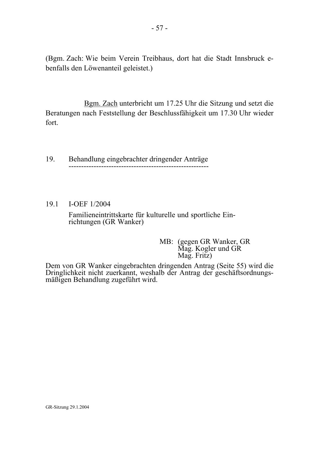 Bgm. Zach unterbricht um 17.25 Uhr die Sitzung und setzt die