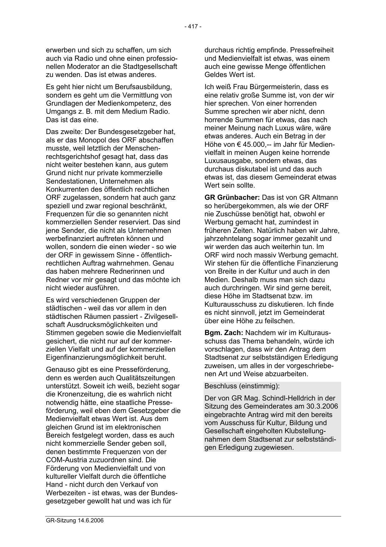 Bgm. Zach: Nachdem wir im Kulturausschuss das Thema behandeln, würde ich