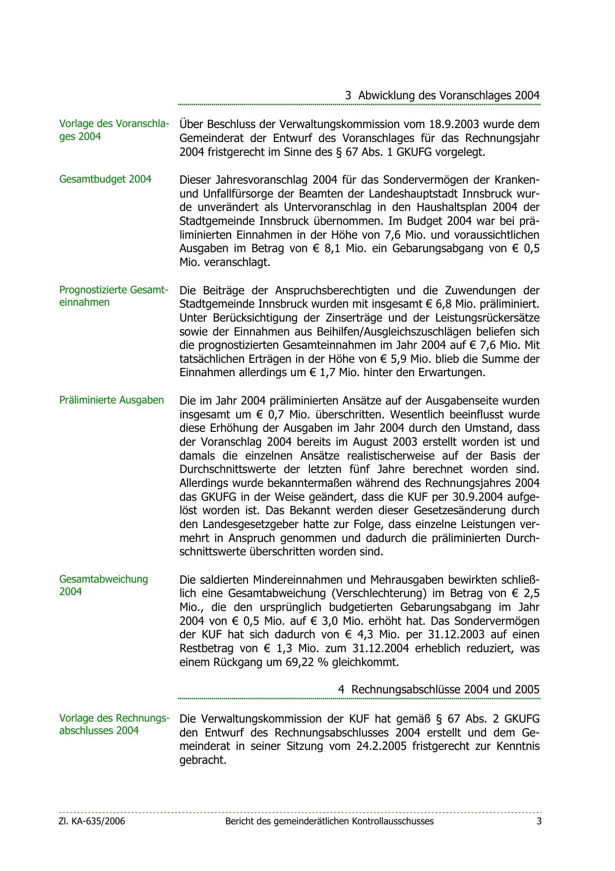 Dieser Jahresvoranschlag 2004 für das Sondervermögen der Krankenund Unfallfürsorge der Beamten der Landeshauptstadt Innsbruck wurde unverändert als Untervoranschlag in den Haushaltsplan 2004 der