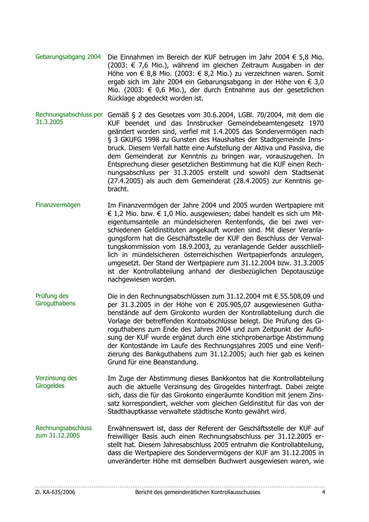 Entsprechung dieser gesetzlichen Bestimmung hat die KUF einen Rechnungsabschluss per 31.3.2005 erstellt und sowohl dem Stadtsenat