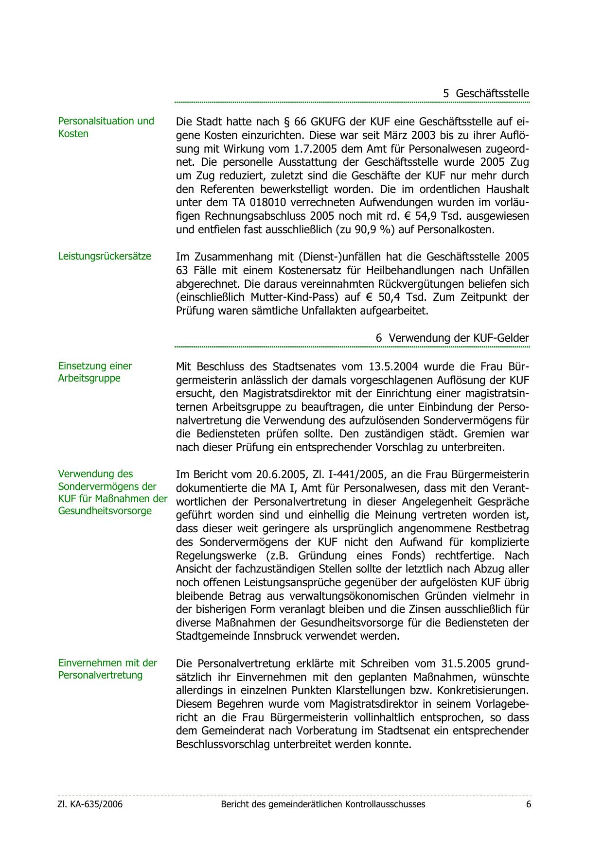Die Stadt hatte nach § 66 GKUFG der KUF eine Geschäftsstelle auf eigene Kosten einzurichten. Diese war seit März 2003 bis zu ihrer Auflösung mit Wirkung vom 1.7.2005 dem Amt für Personalwesen zugeordnet. Die personelle Ausstattung der Geschäftsstelle wurde 2005 Zug
