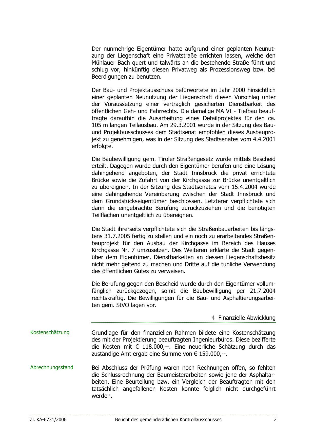Die Stadt ihrerseits verpflichtete sich die Straßenbauarbeiten bis längstens 31.7.2005 fertig zu stellen und ein noch zu erarbeitendes Straßenbauprojekt für den Ausbau der Kirchgasse im Bereich des Hauses