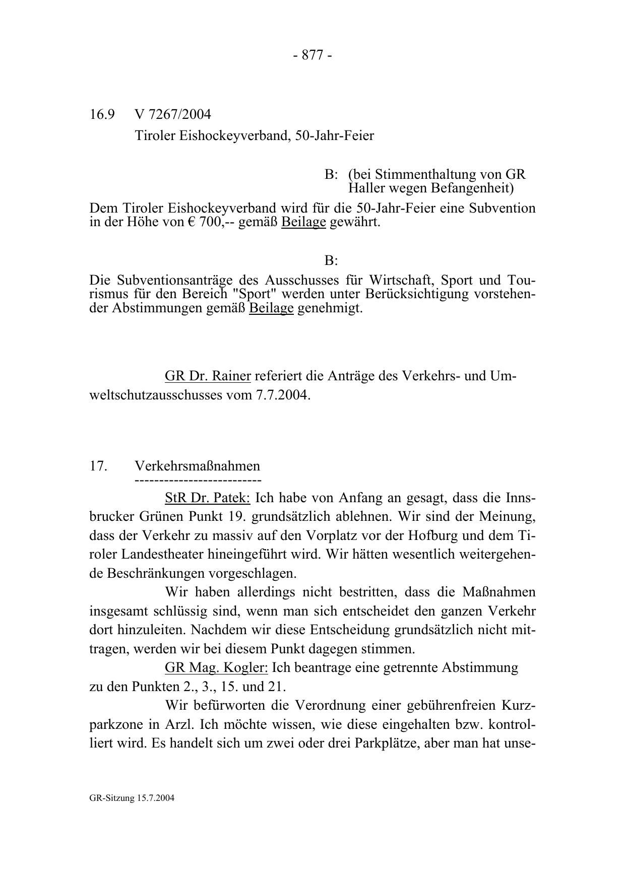 GR Dr. Rainer referiert die Anträge des Verkehrs- und Umweltschutzausschusses vom 7.7.2004.