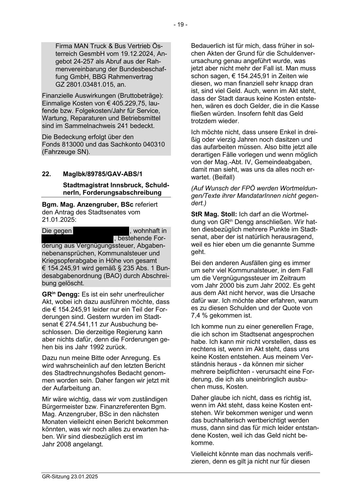 Stadtmagistrat Innsbruck, SchuldnerIn, Forderungsabschreibung