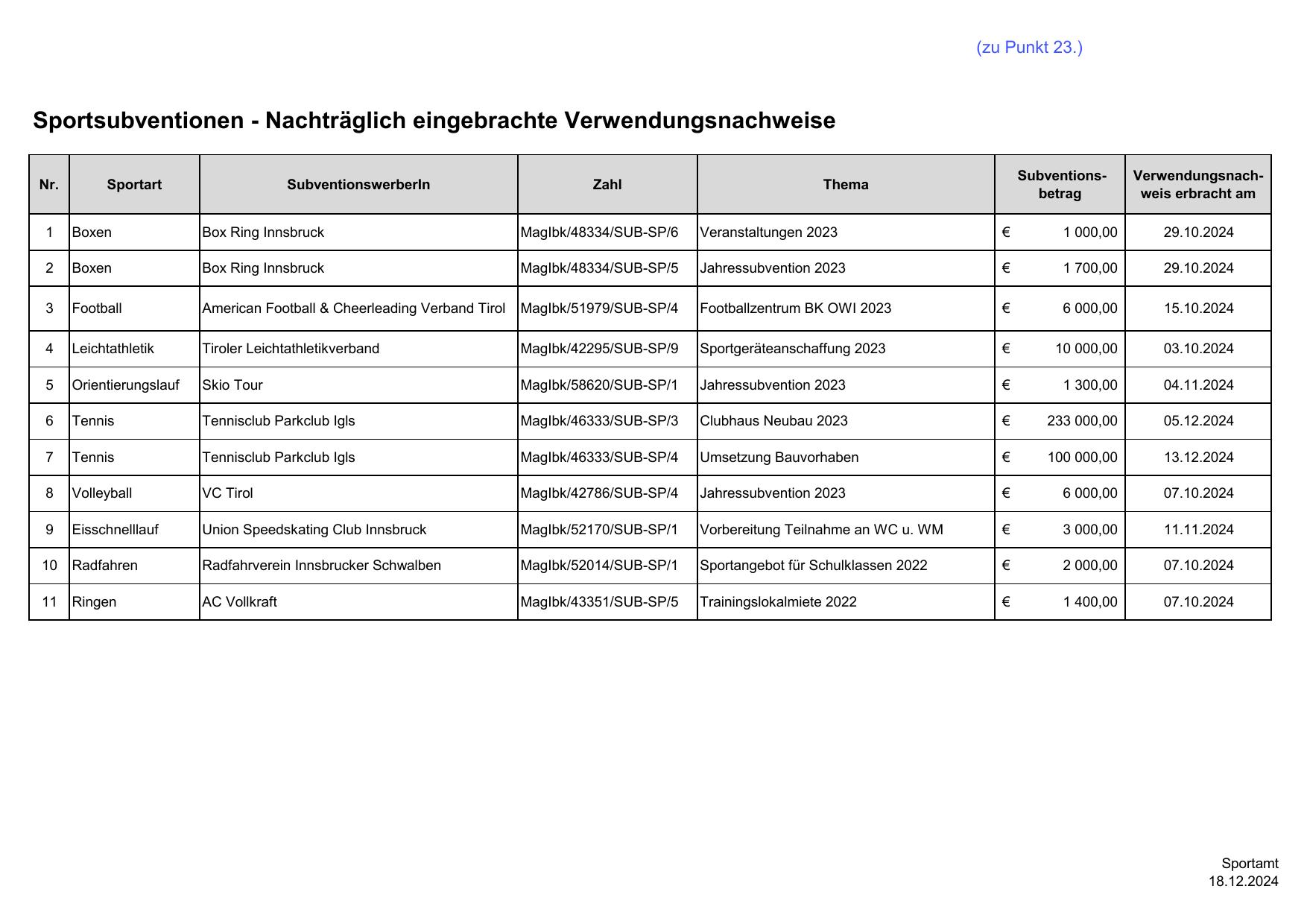 Sportsubventionen - Nachträglich eingebrachte Verwendungsnachweise