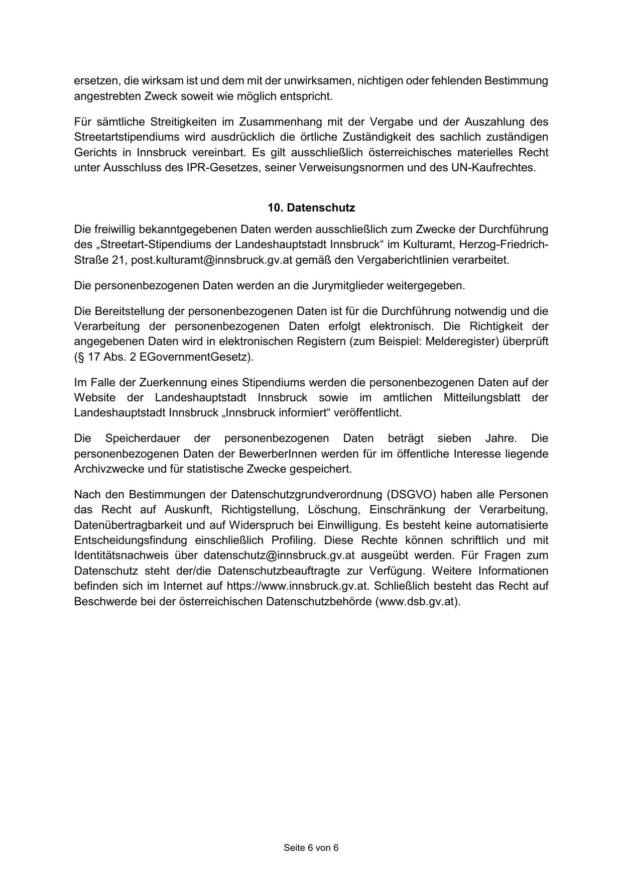 des „Streetart-Stipendiums der Landeshauptstadt Innsbruck“ im Kulturamt, Herzog-FriedrichStraße 21, post.kulturamt@innsbruck.gv.at gemäß den Vergaberichtlinien verarbeitet.