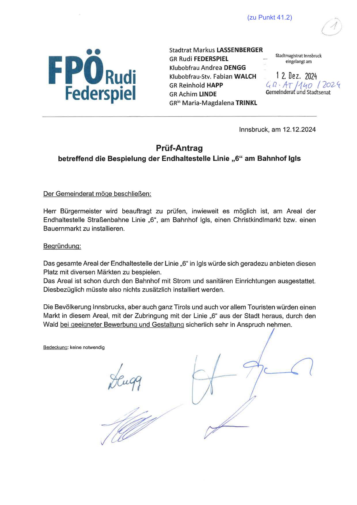 betreffend die Bespielung der Endhaltestelle Linie „6‘“ am Bahnhof Igls