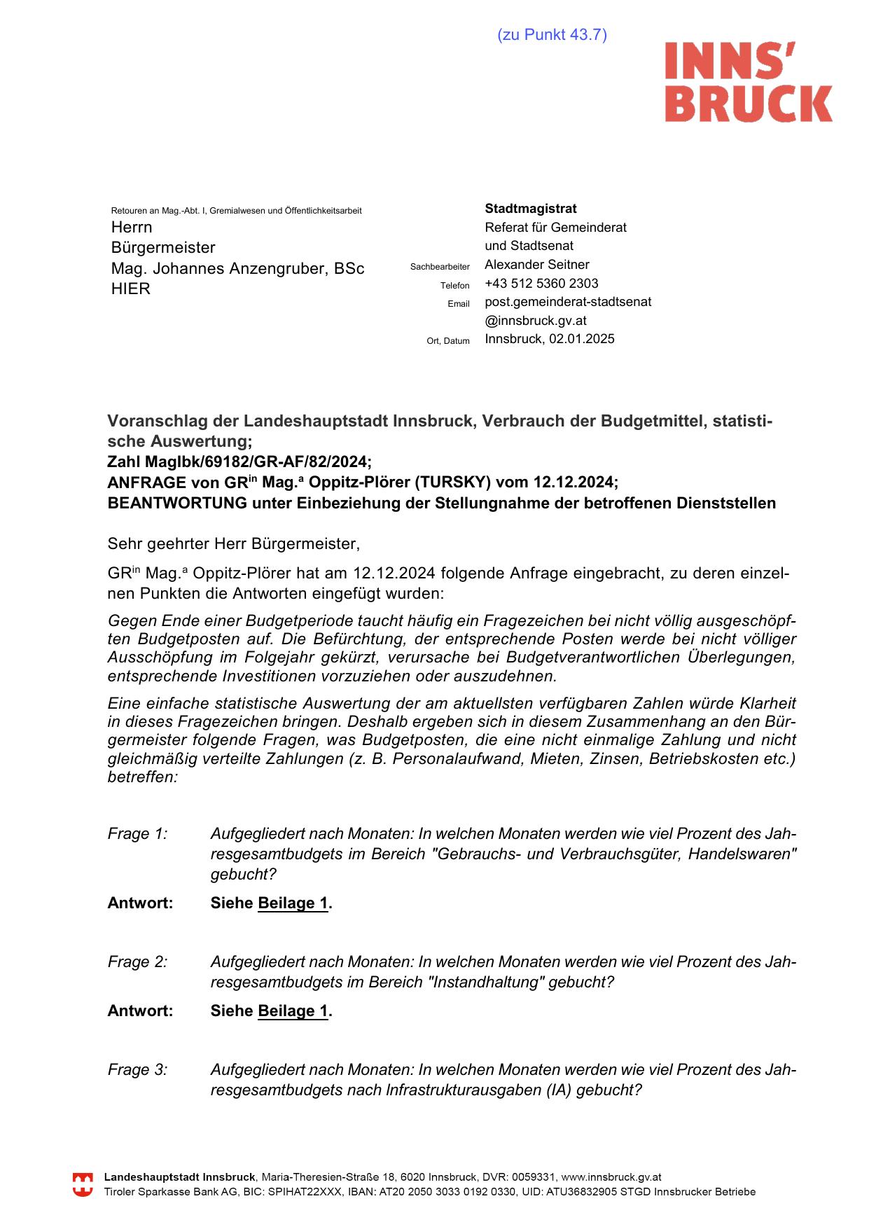 Voranschlag der Landeshauptstadt Innsbruck, Verbrauch der Budgetmittel, statistische Auswertung;