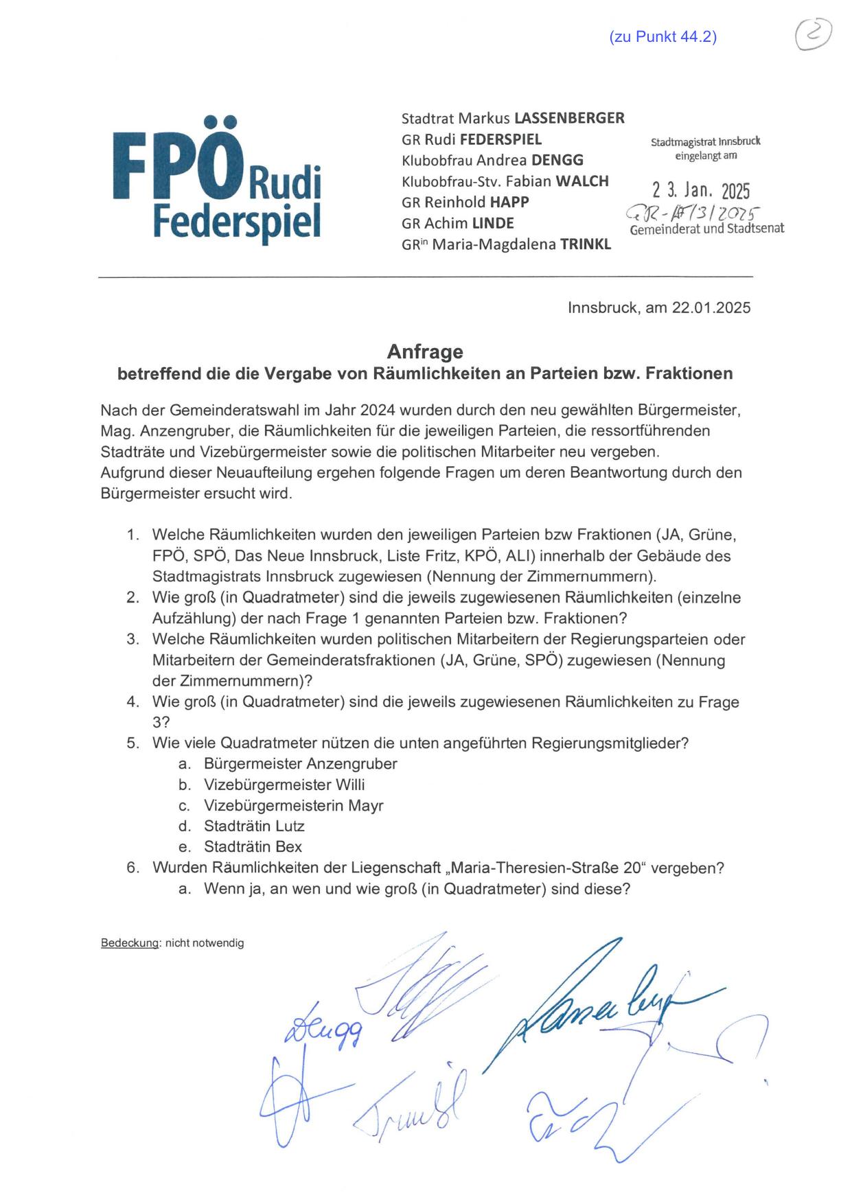 FPÖ, SPÖ, Das Neue Innsbruck, Liste Fritz, KPÖ, ALI) innerhalb der Gebäude des
