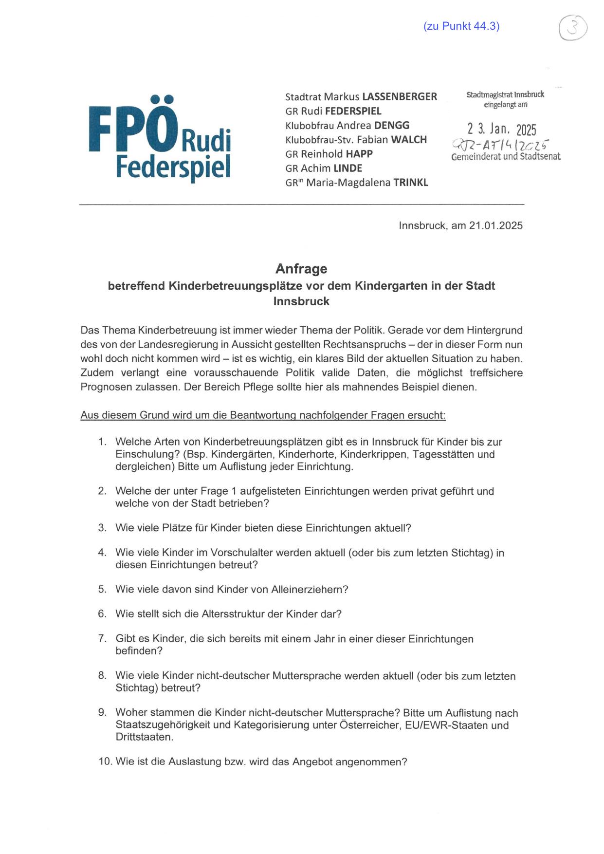 betreffend Kinderbetreuungsplätze vor dem Kindergarten in der Stadt
