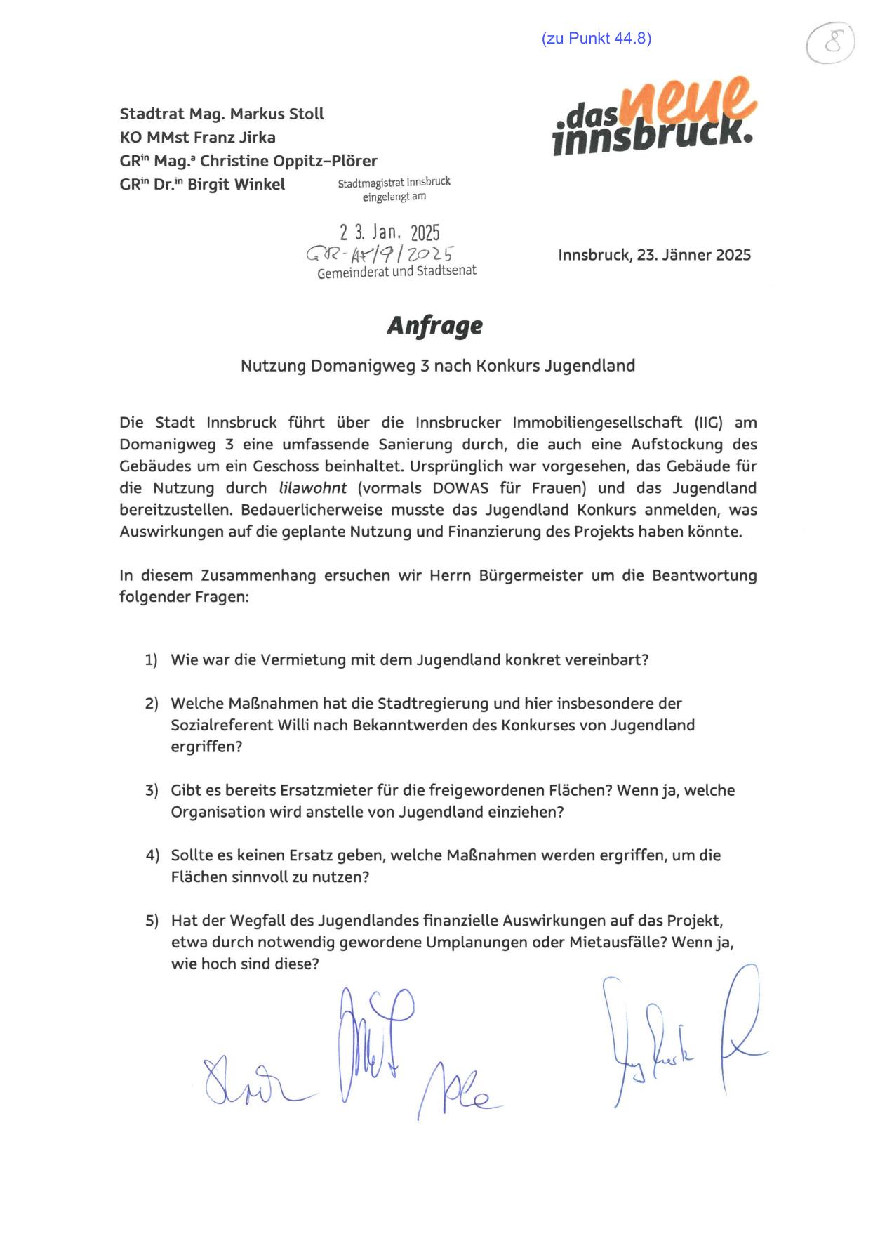 Nutzung Domanigweg 3 nach Konkurs Jugendland