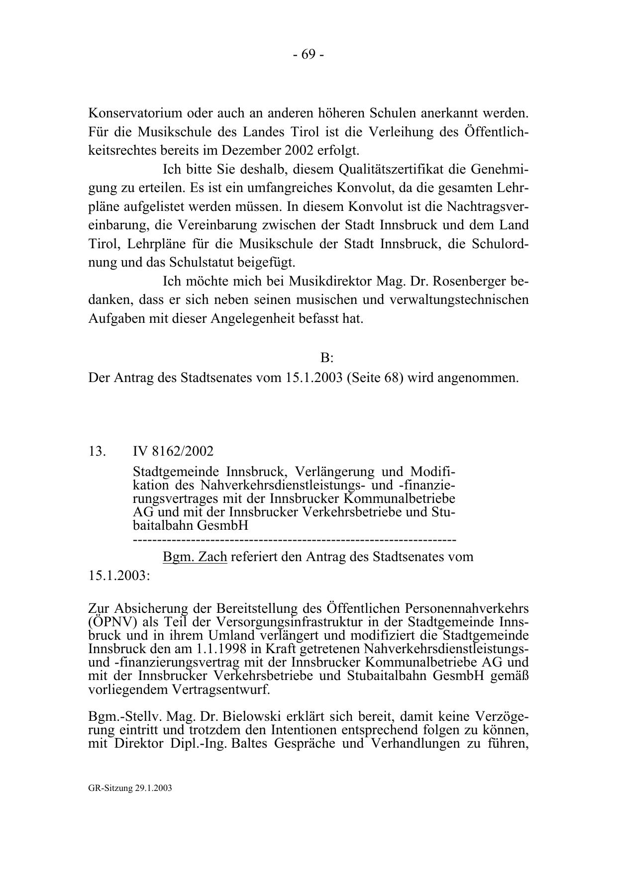 Der Antrag des Stadtsenates vom 15.1.2003 (Seite 68) wird angenommen.