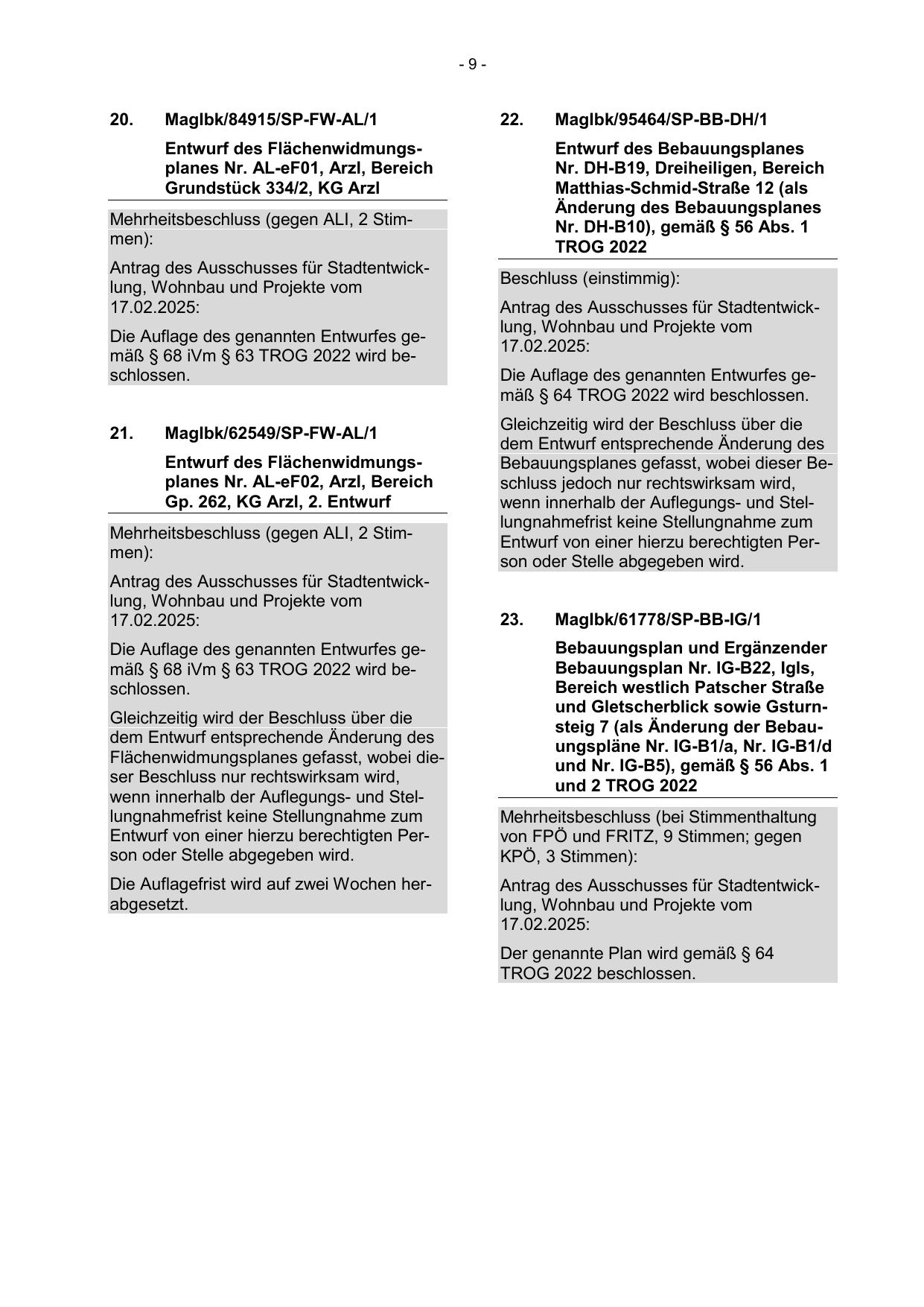 von FPÖ und FRITZ, 9 Stimmen; gegen