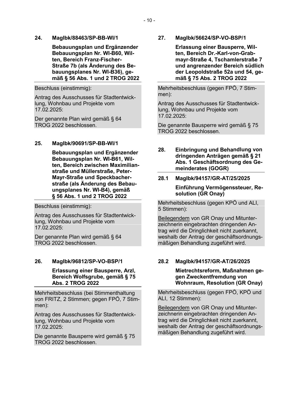 Mehrheitsbeschluss (gegen FPÖ, KPÖ und