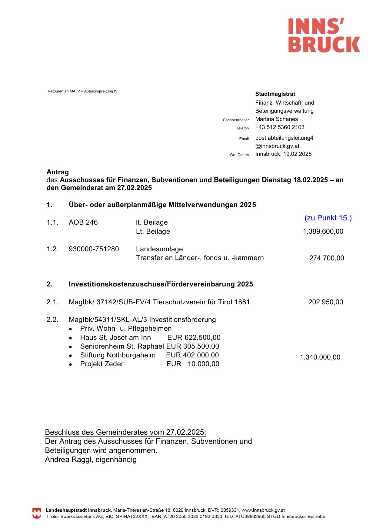 Tiroler Sparkasse Bank AG, BIC: SPIHAT22XXX, IBAN: AT20 2050 3033 0192 0330, UID: ATU36832905 STGD Innsbrucker Betriebe