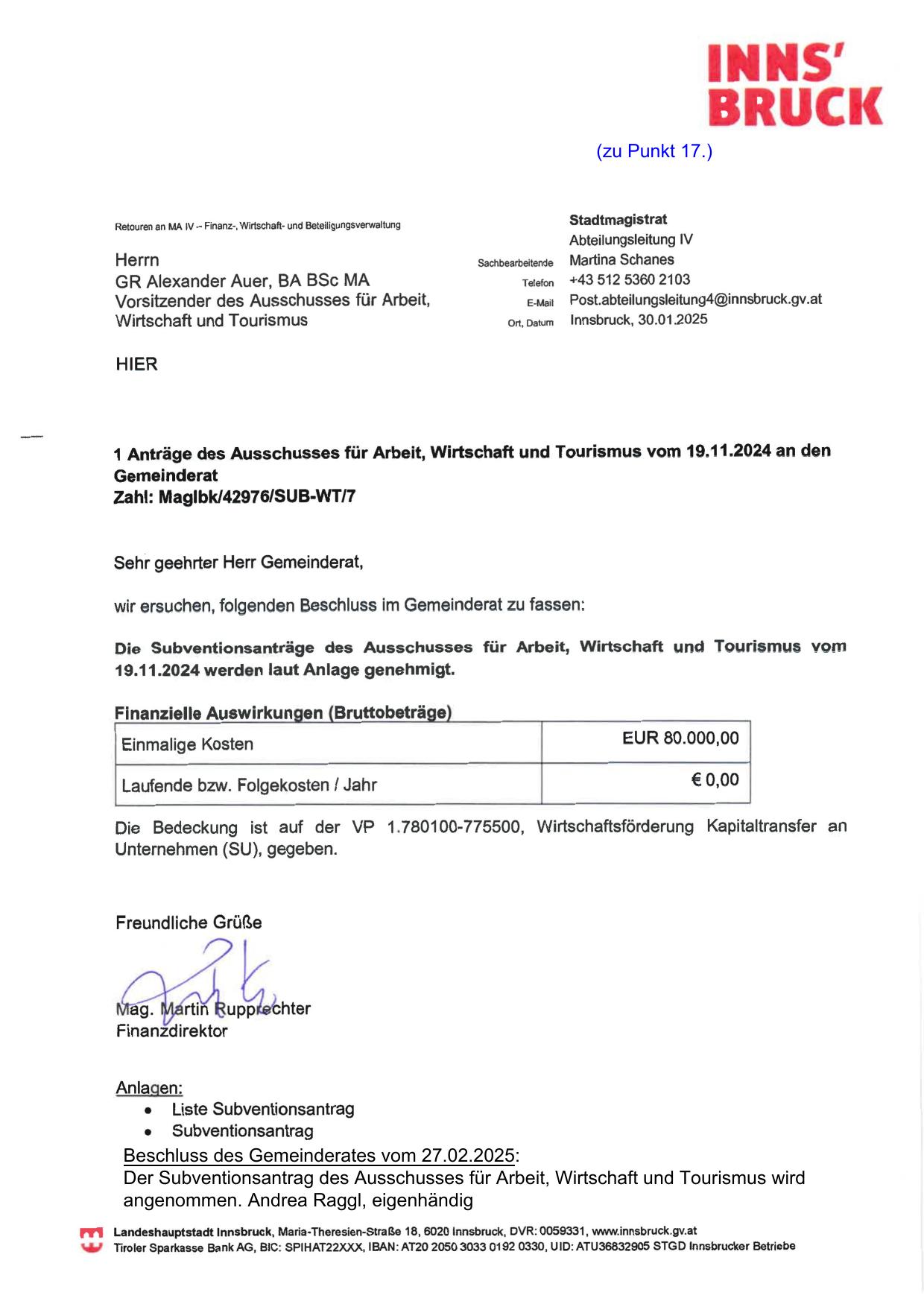 alb! Tiroler Sparkasse Bank AG, BIC: SPIHAT22XXX, IBAN: AT20 2050 3033 0192 0330, UID: ATU36832905 STGD Innsbrucker Betriebe